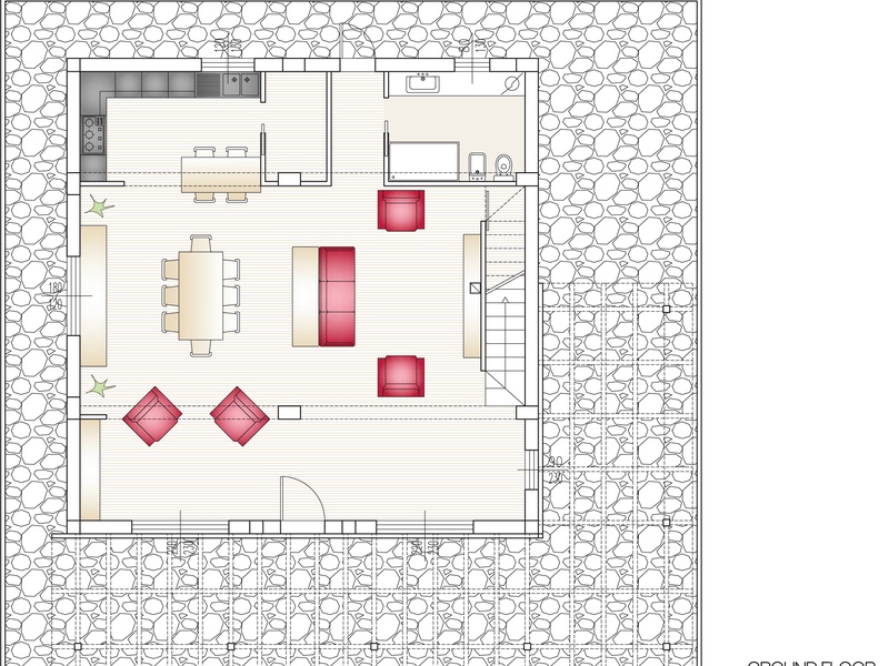 Внутренняя планировка дома: На первом этаже большая гостиная комната с камином , столовая , кухня, ванная комната с сауной и подсобное помещение.  с выходом во внутренний двор с барбекю