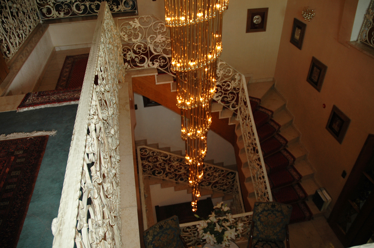 К обстановке относится огромный канделябр из кристаллов, ценные шелковые персидские ковры, предметы антиквариата, ценные картины и элементы декора. Мраморный пол. Роскошный туалет для гостей.