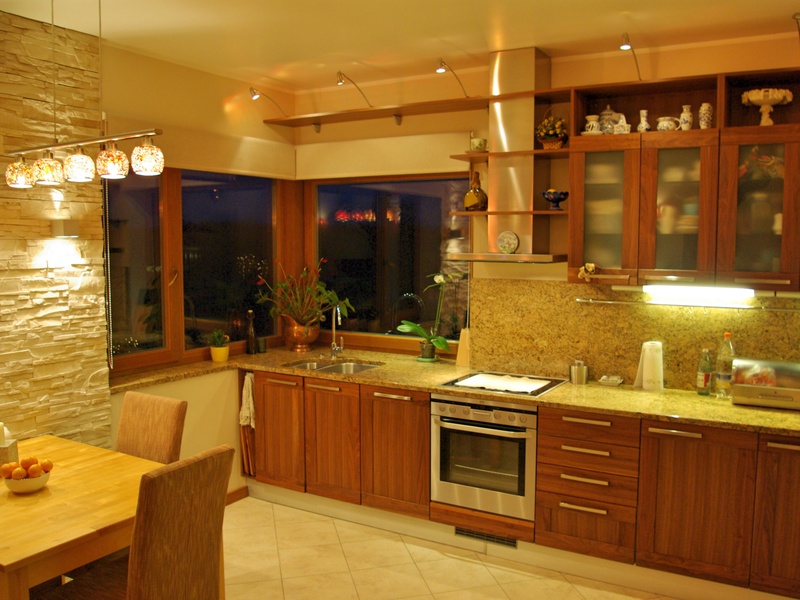 Кухня оборудована высококачественной мебелью из натурального ореха. Рабочая поверхность выполнена из гранита. Кухонная техника: керамическая плита AEG, холодильник с морозильной камерой и подачей льда, посудомоечная машина, интегрированный духовой шкаф с функцией гриль.