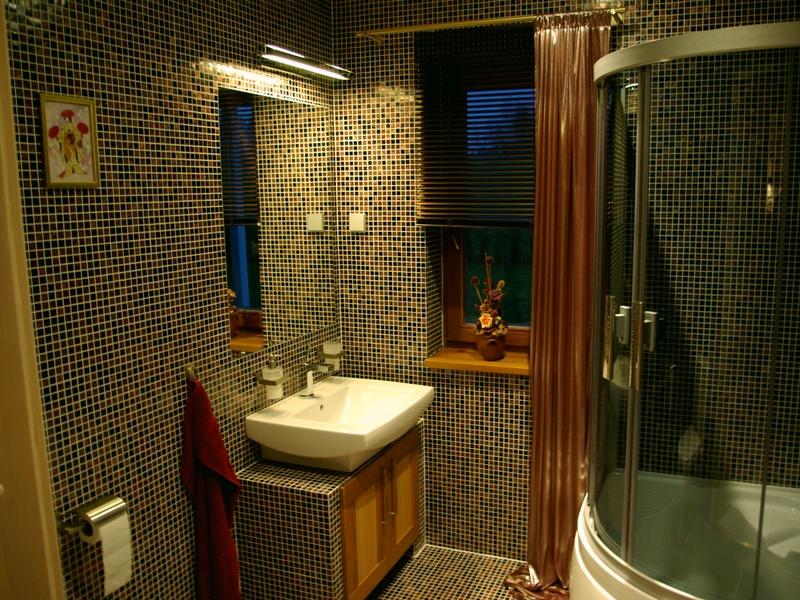 Ванные комнаты сочетаются с туалетом. В ванной комнате первого этажа установлена душевая кабина, а в ванной комнате второго этажа кабина паровой бани с душем. Полы и стены отделаны элегантной мозаикой натурального венецианского стекла. Сантехника представлена брендами Villeroy & Boch и Hansgrohe. Электрический подогрев полов.