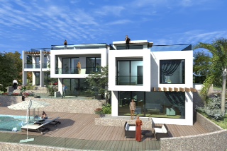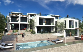 Проект состоит из трех домов сформированных как таунхаусы со своим бассейном, местами для парковки и общей зеленой придомовой территорией. Дома состоят из 2х этажей. Общая площадь домов: