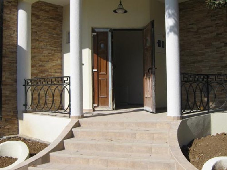 Вход в основной хозяйский дом начинается с широкой каменной лестницы, ведущей на крыльцо, обрамленное солидными колоннами. Массивная входная дверь отделана деревом по металлической основе. Все деревянные элементы отделки привезены по специальному заказу застройщика из Испании.
