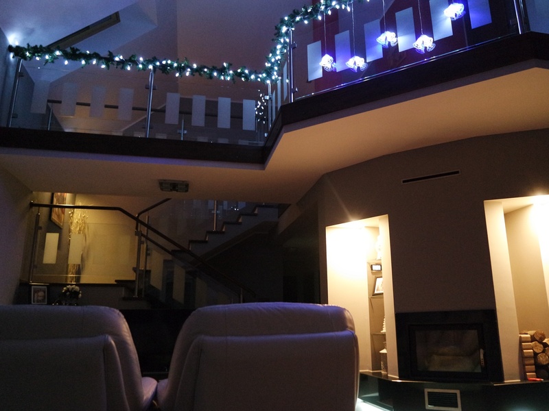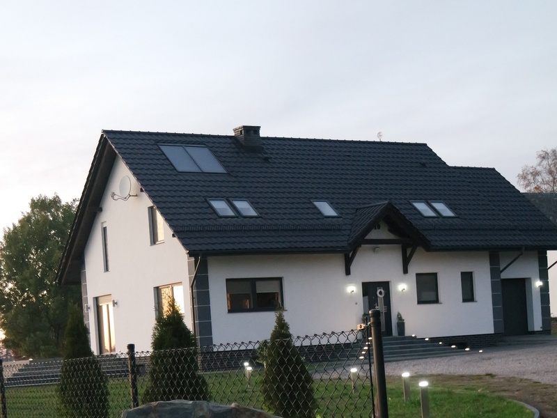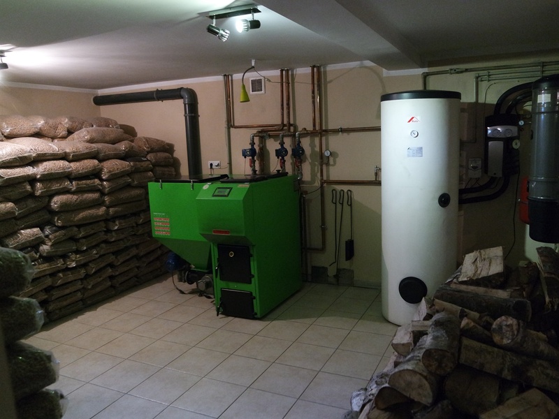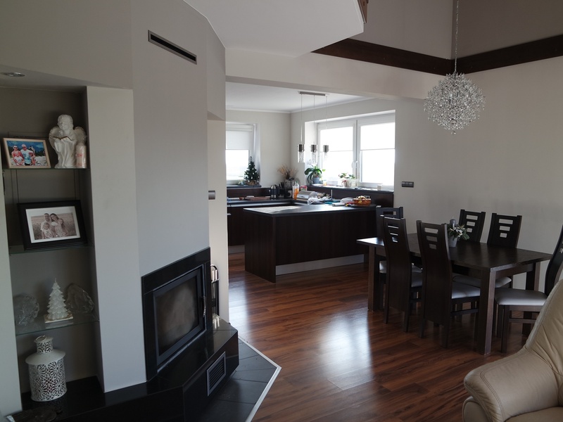 The house has a central vacuum cleaner, one heat solar hot water on the roof (in summer), chimney with water coat 17 kW (reaches in autumn around the whole house to heat and a wood-Pelletheader (heating costs in the year approx. 700€ (3000zloty). Almost everywhere under-floor heating (but not cellar and garage). Garage in the house in it (heats).