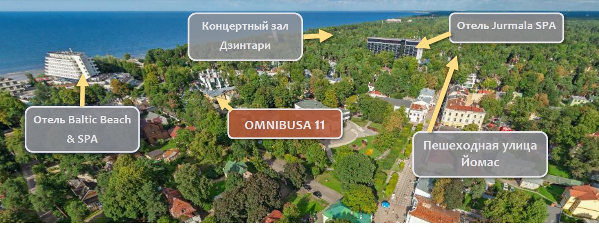 Нахождение в прибрежной зоне Рижского залива, в самом сердце Юрмалы, между пляжем и знаменитой центральной пешеходной улицей Йомас