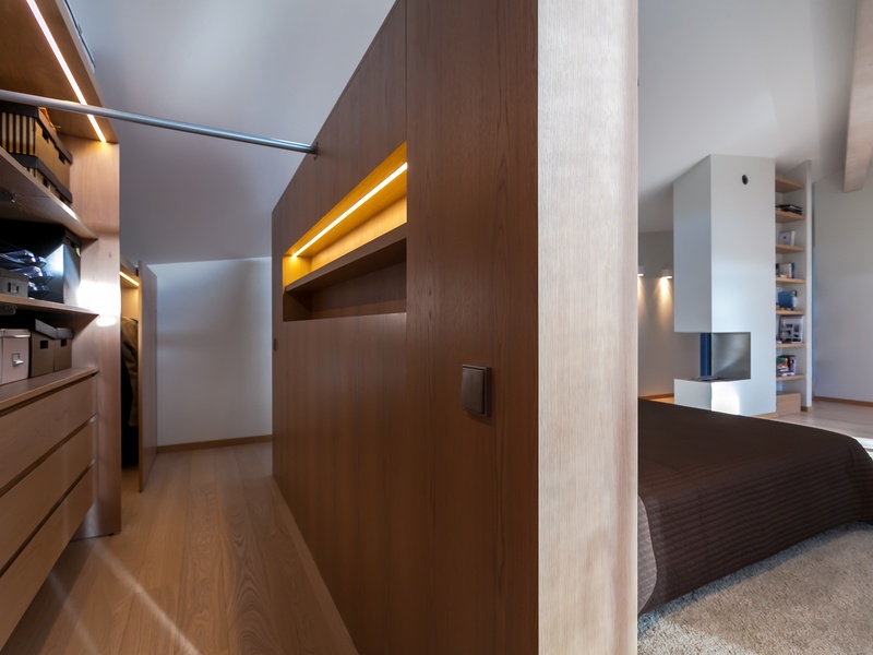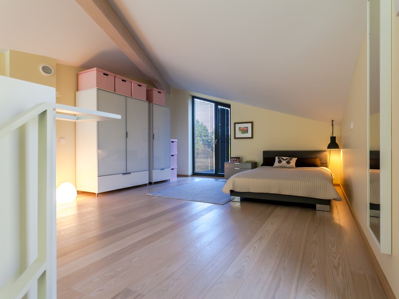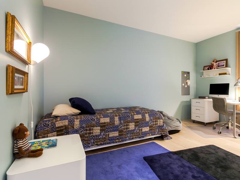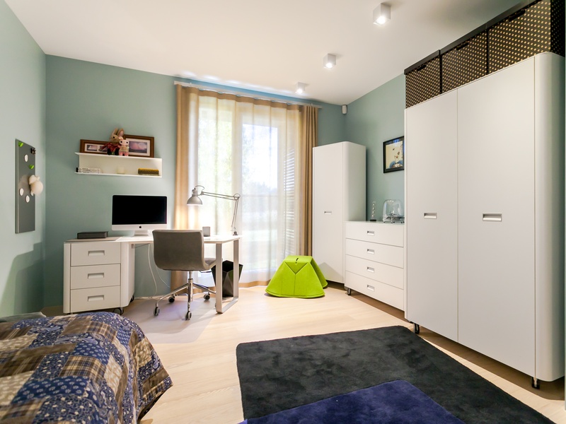 К детским комнатам ведет прихожая на первом этаже. Первая спальная комната расположена на первом этаже. Вторая – на двух этажах. На первом этаже есть просторный уголок отдыха, с книжными полками, на втором этаже – кровать и гардероб. У комнат в третьей части дома есть отдельный вход в ванную и баню.