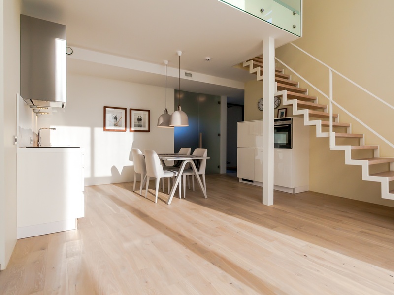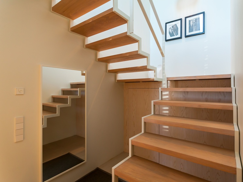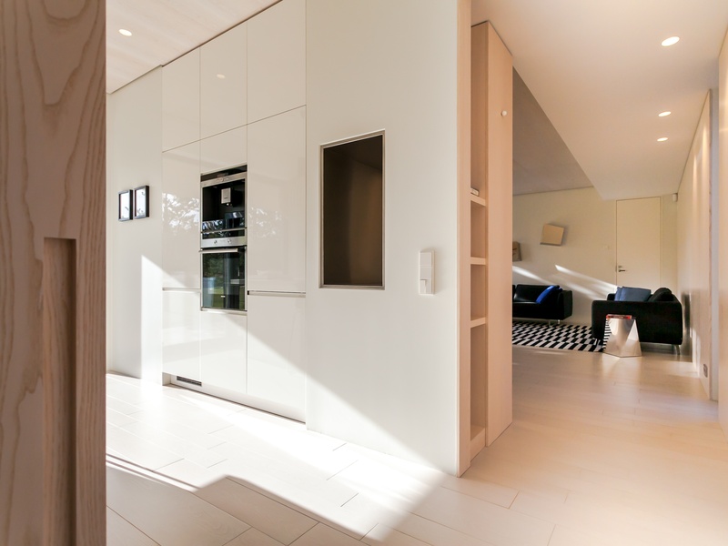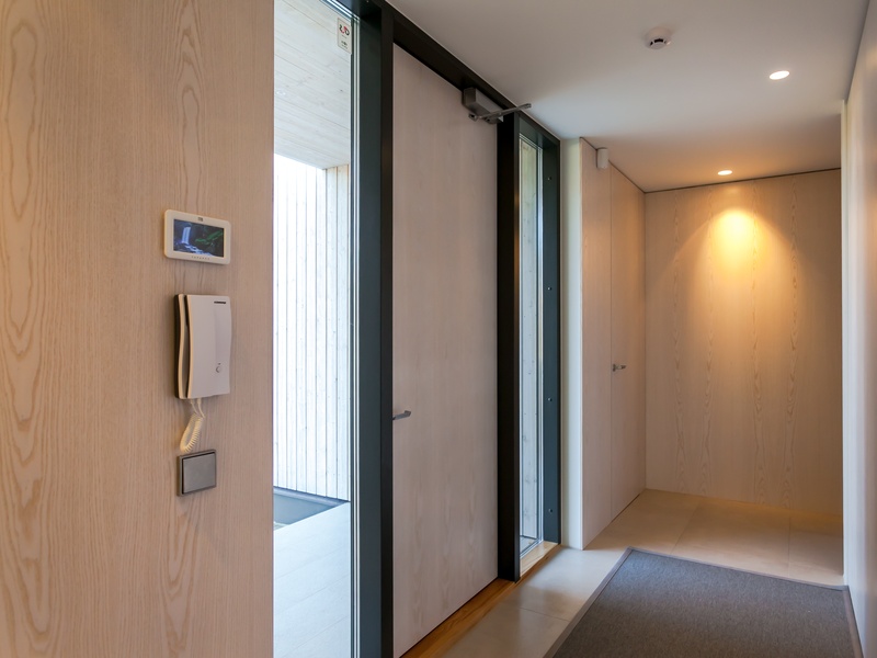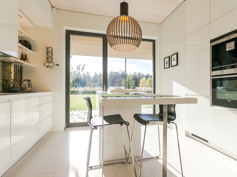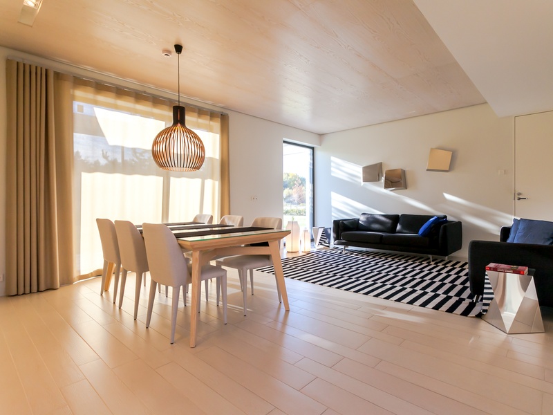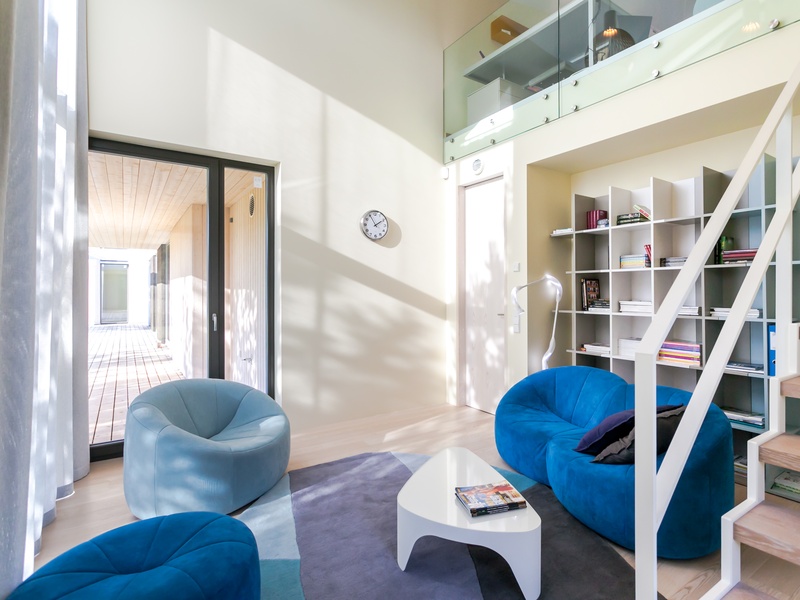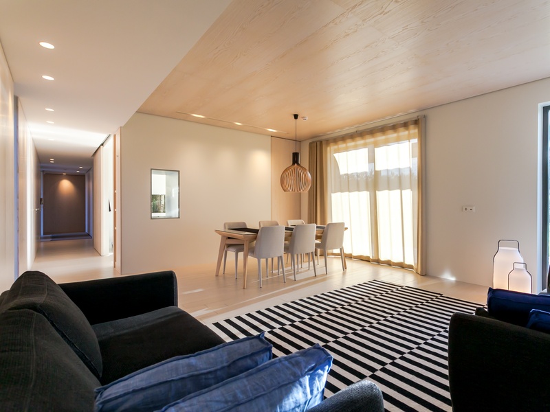При оформлении интерьера использовались как можно более качественные, современные и безопасные для здоровья отделочные материалы. В доме необычно высокие двери (2,4 м), в общей сложности 12 дверей. Потолки жилой комнаты, кухни и гардеробной ниши в прихожей отделаны беленым шпоном, на полах – белый деревянный паркет. Между жилой комнатой и кухней есть ниша в стене, в которой установлен спиртовой камин. Камин можно установить и в основной спальне на первом этаже.