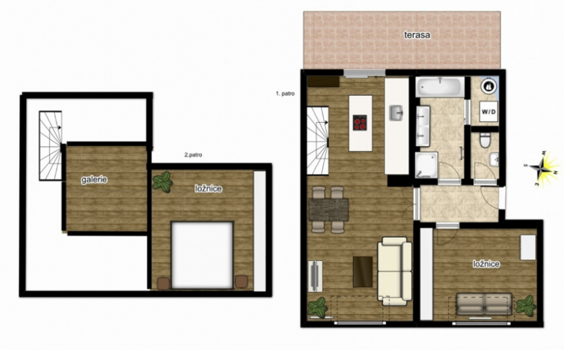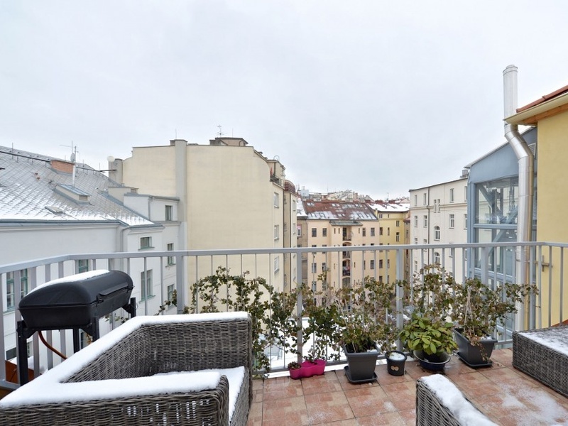 Планировка квартиры предлагает гостиную, соединенную с кухней (45м2), две спальни, галерею, ванную комнату, кладовую, отдельный туалет и коридор. Жилое пространство с кухней переходит в приятную, ориентированную на западную сторону, солнечную террасу (15м2) с видом на внутренний двор. Несмотря на местоположение квартира очень тихая и построена по самым высоким стандартам качества и дизайна с использованием современных технологий и материалов: кондиционирование воздуха, деревянный «плавающий» пол, керамическая напольная плитка и итальянская настенная плитка, алюминиевые окна с двойным изоляционными стеклами, кухонный гарнитур Gorenje с качественной техникой Gorenje + , входная дверь повышенной безопасности, деревянные межкомнатные двери, индивидуальный газовый котел. Из больших окон ательерного типа открывается панорамный вид на башни церкви на Строссмайеровой площади (Strossmayerovo náměstí).