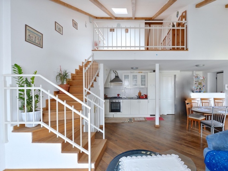 Интерьер этой двухуровневой квартиры состоит из гостиной с кухней, 3-х спален, 2-х ванных комнат, гардеробной и галереи. В квартире есть балкон, который ориентирован на зеленый двор. Оснащение квартиры включает в себя деревянный пол, новые деревянные евро окна и потолочные окна марки Velux, межкомнатные двери из массива дерева и входную дверь повышенной безопасности, индивидуальный газовый котел. Мансардная постройка с 2006 года.