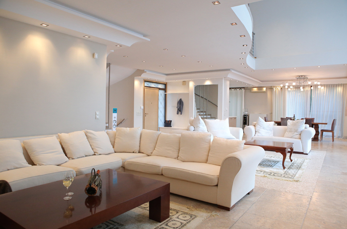 На первом этаже расположена просторная гостиная с камином, кухня с отдельным выходом на участок, одна гостевая комната и туалет. Кухня оснащена всеми необходимыми для готовки и трапезы приборами. Одно из достоинств этой виллы – центральная часть гостиной, которая имеет высоту потолков двух этажей и огромное панорамное окно с видом на море и на второй палец.