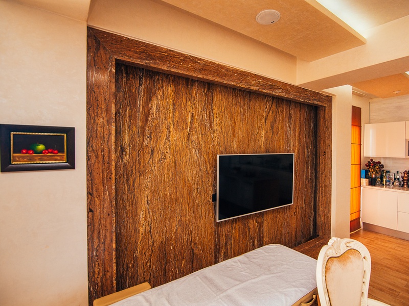 Фасад: гранит бежевого цвета фирмы «Травертини» , трёхкамерные стеклопакеты.
