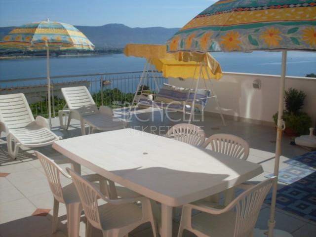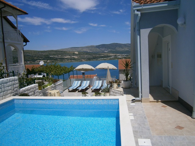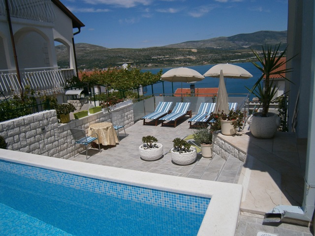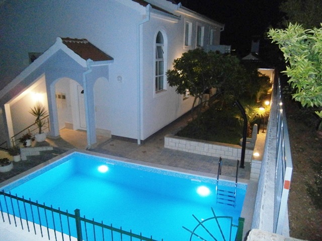 Villa is placed on a plot (size of plot: 500m2), it has pool and jacuzzy. Open sight on the sea from which it is 100m away. It was built on 3 floors: on the ground floor there are 2 suites (36m2 each) that consist of bedroom, kitchen, living room, bathroom, terrace). ). On the first floor there are  2 double bedroom suites (2 bedrooms, kitchen with dinning room and living room, bathroom, balcony). On the second floor there is one double bedroom apartment (size: 70m2) and one single bedroom apartment (size: 45m2). Luxury and modern furniture (included in price). Solar and central heating, all apartments have air-conditioning, villa has 4 stars.
