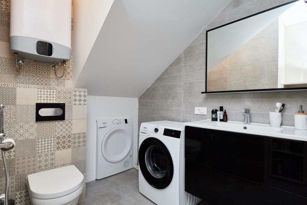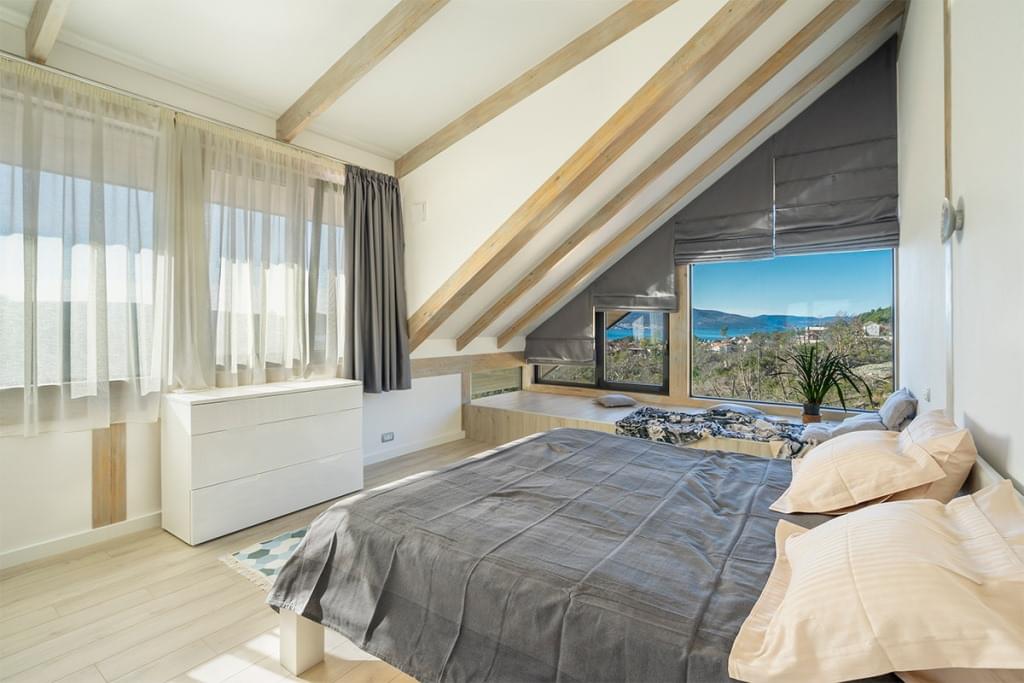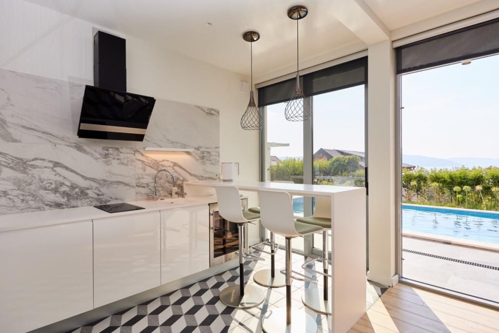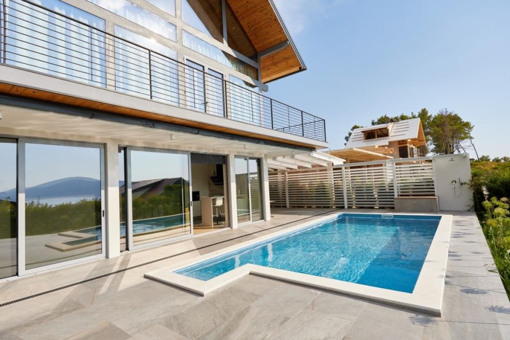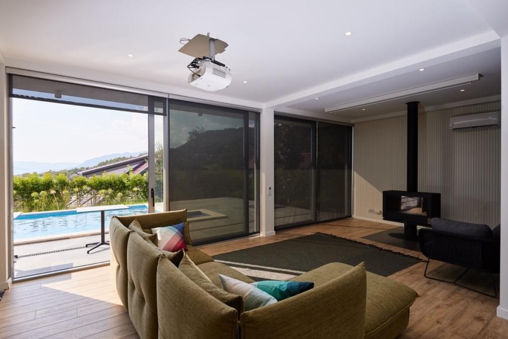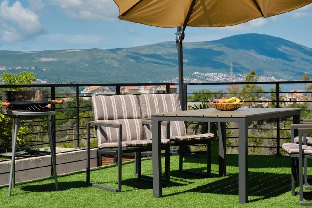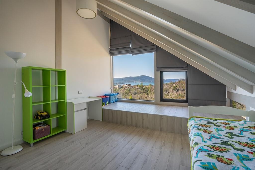 Современный высокотехнологичный новый дом с 4 спальнями находится в закрытом зеленом поселке в пригороде Тивата. Дом построен по немецкой технологии фахверк из современных материалов премиум-класса.