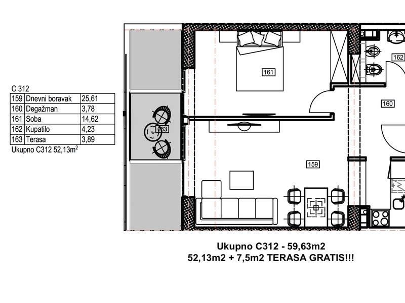 2-х комнатная квартира № С312 (высота пятого) с видом на улицу Медитеранская в эксклюзивном мульти-комплексе «Porto Budva» с торговым центром 8000 м2 и СПА-центром 3500 м2 с широким спектром услуг, c конференц-залом и рестораном, открытым и крытым бассейнами!