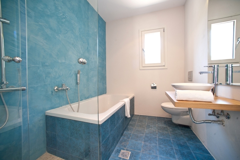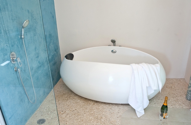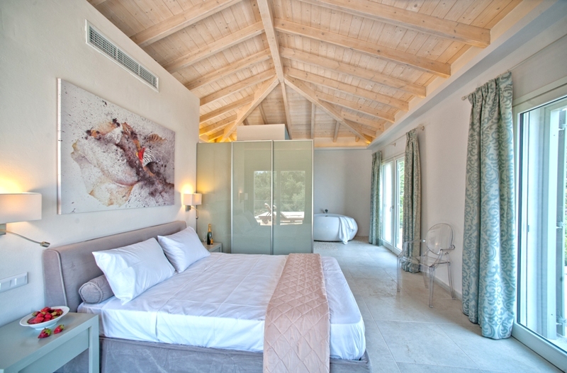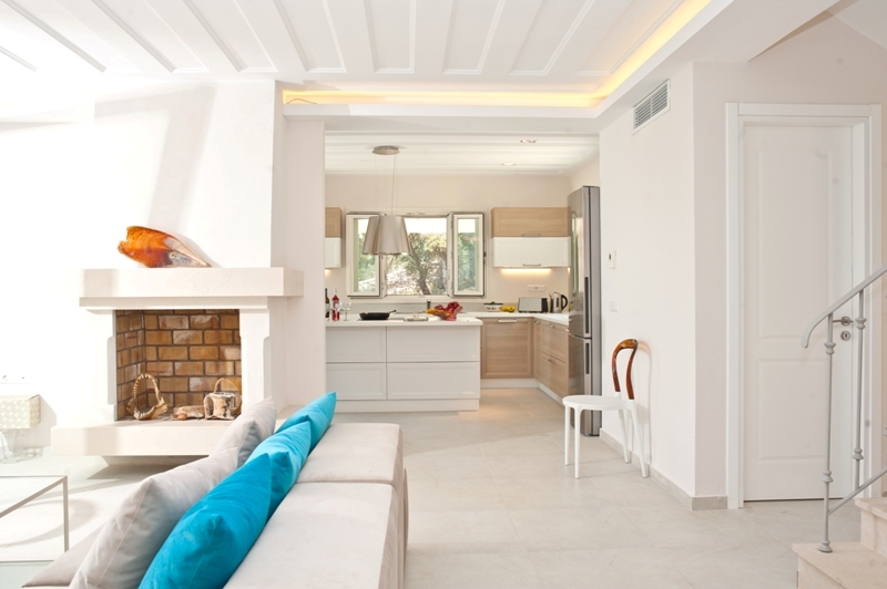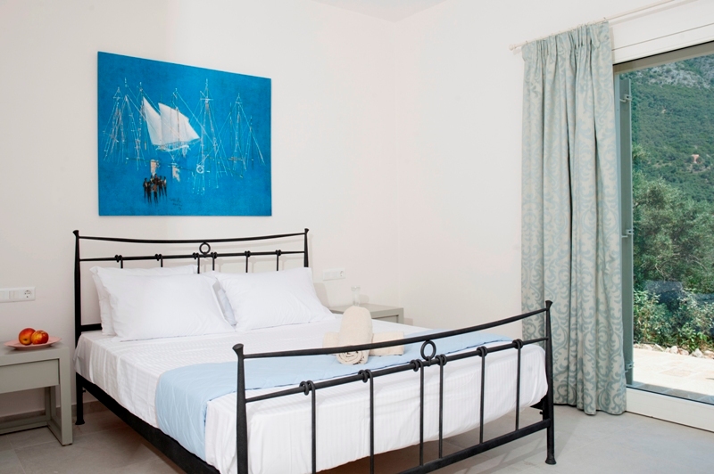 На первом этаже расположены: спальня с душевой комнатой и балконом с видом на оливковую рощу, спальня с душевой комнатой и французскими окнами в сад.