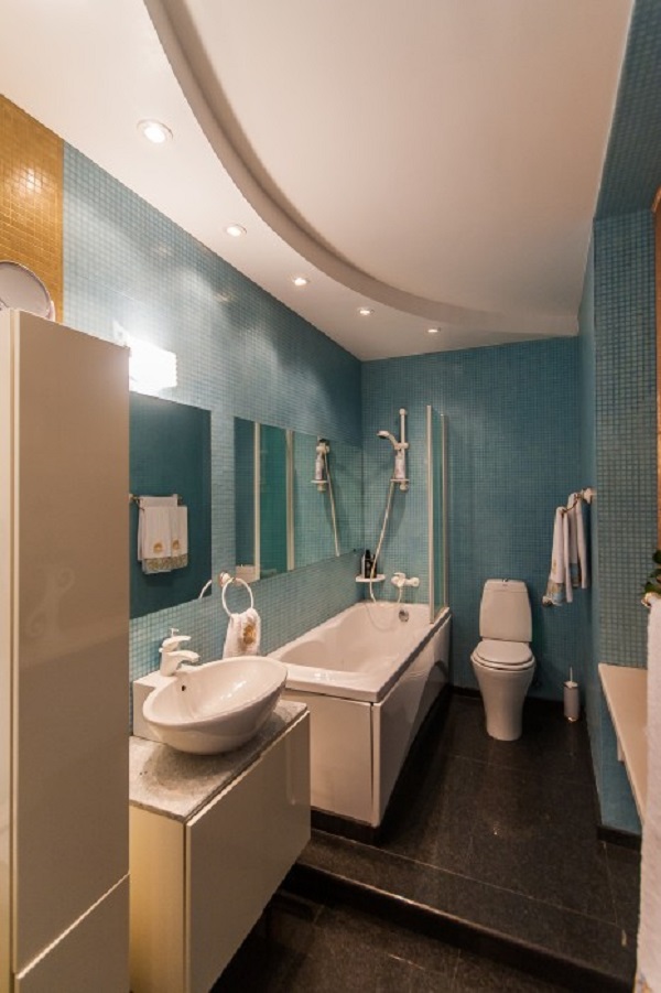 Ванная комната из голубой и золотой мозаики, мраморные полы с подогревом, золотые шторы, две современные раковины, белые шкафчики, ванна, туалет.