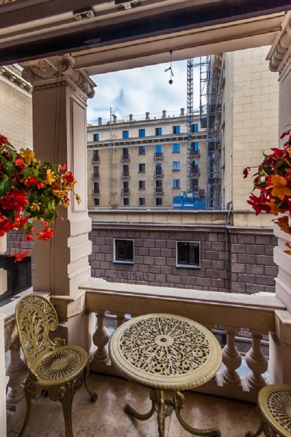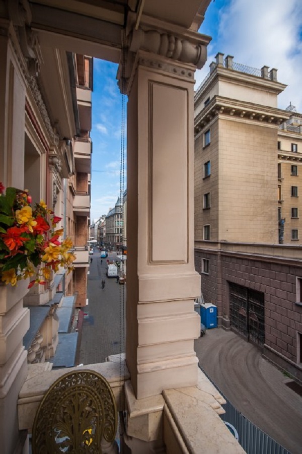 В гостиной есть выход на очаровательный балкончик, с обширным видом на улицу Вальню. Пол и подоконник в котором выложены из мрамора, а для создания боле приватной атмосферы, можно отгородиться специально встроенными жалюзи.