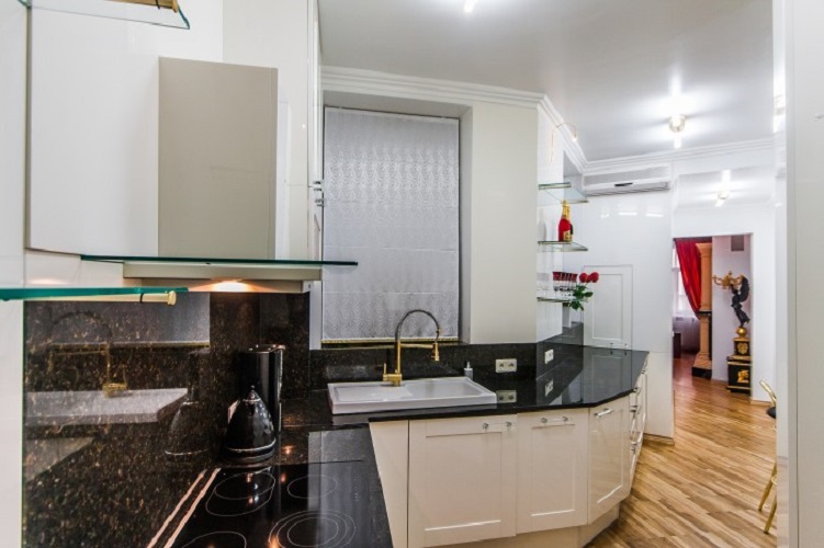 Кухня высокого качества, с белыми глянцевыми шкафчиками, встроенное освещение, позолоченный водопроводный кран, мраморные столешницы, белые шторы. Кухонные приборы перечисленные в инвентарном списке.