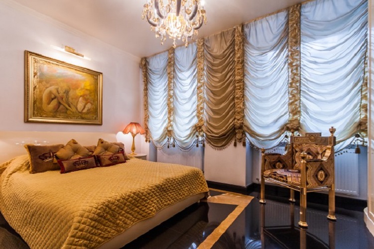 Для достижения релаксации в главной спальне использованы золотисто - пастельные тона. Подогреваемые полы из мрамора и оникса, мебель с элементами Versace, шторы и чистого шелка в стиле "Marquis ".