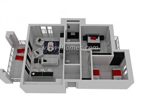 Квартира состоит из просторной гостиной "американского" типа, совмещена с кухней, двух спален (в одной двуспальная кровать, во второй одно- и двуспальные раскладывающиеся кресла-кровати) и двух ванных комнат.