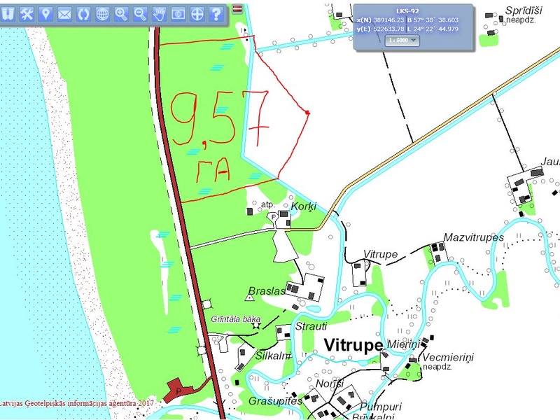 Предлагаю участок 95700кв.м.  в 250м от песчаного пляжа Рижского залива на территории ландшафтного биосферного парка Видземе.До порта Салацгривы 12км.90 км от Риги.Доступ к морю свободный через муницыпальный лес.В р-не устья реки и поселка Витрупе на протяжении 350м граничит с международной магистралью Е-67 ВИА-Балтика.Это единственный отрезок этой трассы во всей Европе,где дорога вплотную приближается к береговой линии и идет вдоль нее 2км.Через асфальтовую дорогу автостоянка с выходом на пляж.Данное место соответствует Европейскому стандарту чистоты воды и песка Синий Флаг с высокой оценкой.Участок Граничит с гостиничным комплексом.Въезд на участок с главной магистрали.Состоит из 66000кв.м.соснового лесопарка-рекреационной зоны-.возрастом до 175лет ,рассположенного на дюнном ландшафте(высотой дюн от 2 до 7м),по которому проходит 2000кв.м.грунтовой дороги через горку в сторону поля,24400кв.м.ровного сельхозполя,на котором разрешено строить дом на фундаменте либо рядный дом на 2 семьи с хозпостройками и 3300кв.м.канала-притока реки Витрупе,который отделяет лес от поля.Разрешено деление всего участка на 3части,на каждой из которых можно строиться.Находится в прибрежной защитной  полосе,где запрещена промышленная деятельность и по плану территориального развития разрешена постройка туристических и рекреационных объектов,поощряется развитие сельского туризма и строительство кемпингов,баз отдыха,мотелей,экопоселков,гостевых домов.Годовой налог 30 евро.Разрешена очередная санитарная вырубка всего леса и 30% его части от дюны до канала под лужайки.Мимо дальнего прямого угла поля проходит эл.линия 20квольт.Владелец-частное лицо.
