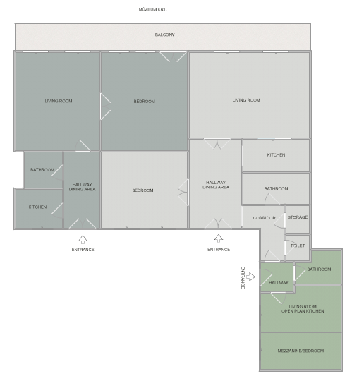 The 3rd apartment  (86 sqm)  consists a hallway with dining area, a fully equipped kitchen, a bathroom with a tub and toilet, a large living room, a large bedroom and a balcony facing Múzeum garden. It has a separate gas heating system.