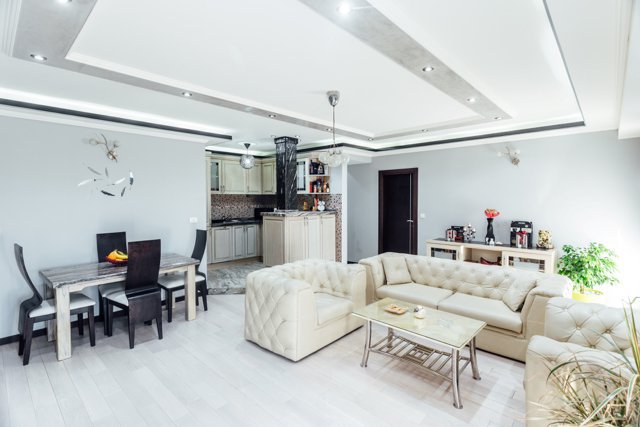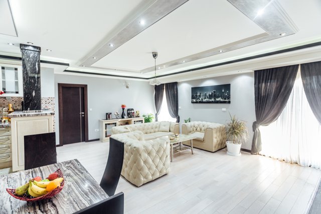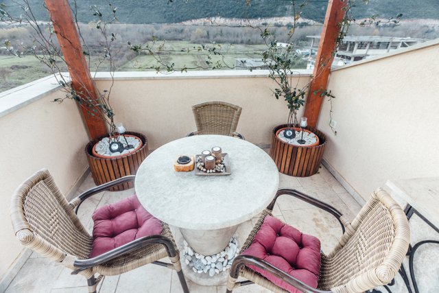 Площадь квартиры составляет 123м2. Планировка квартиры состоит из двух спален, просторной гостиной, совмещенной с зоной кухни и столовой, ванной комнаты и большой террасы с видом на окрестности и море.