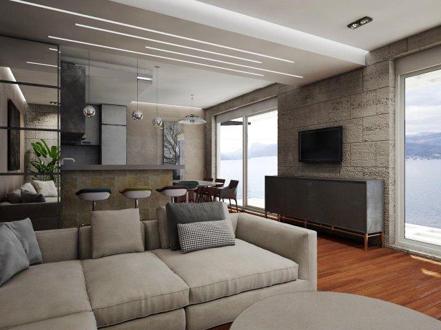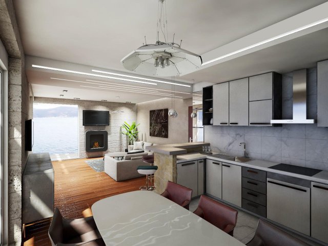 3-й уровень — гостиная совмещенная с кухней, прихожая, ванная комната, выход на парковку, терраса. Изо всех окон открывается панорамный вид на море.
