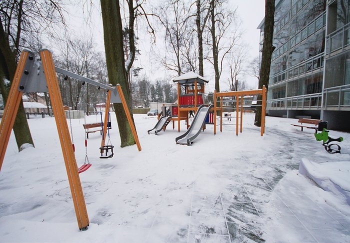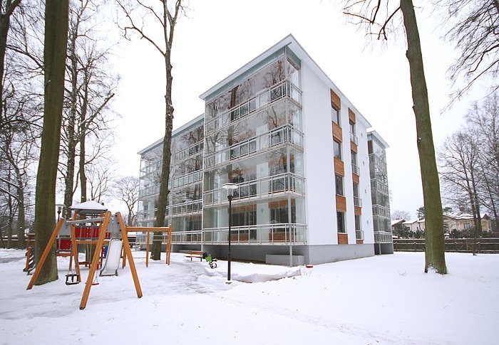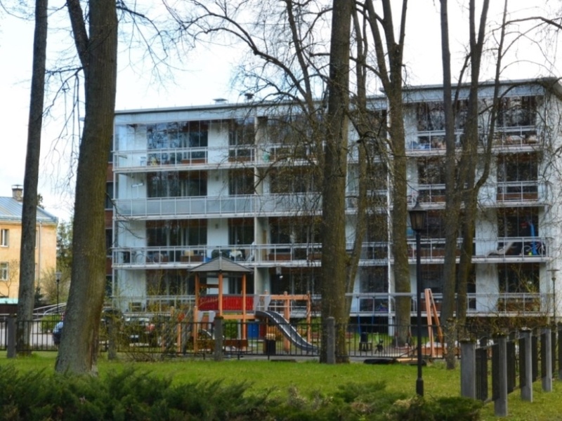 ДОМ: 4-х этажный дом нового проекта в Риге, на улице Виенибас гатве 87i. Рядом с домом располагается детская площадка.