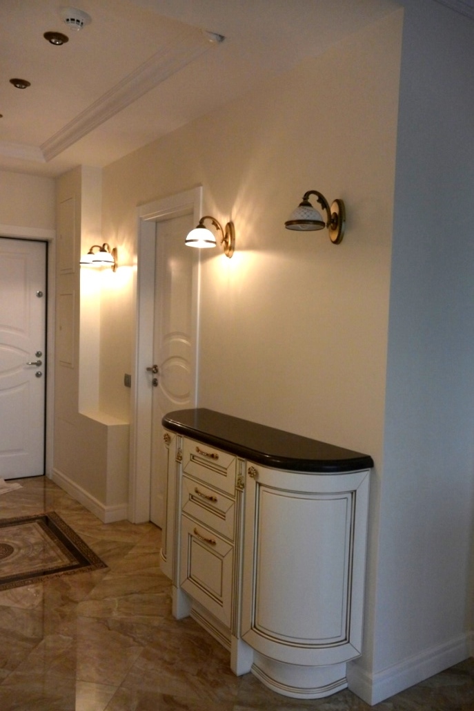 Дизайн квартиры выдержан в светлых пастельных тонах. Все помещения оборудованы светильниками.