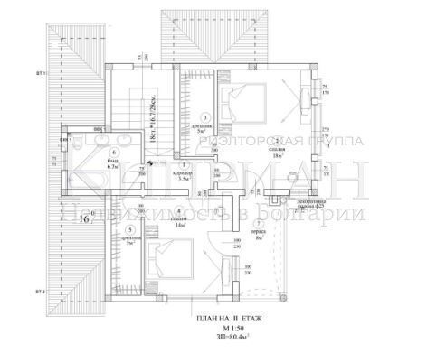 Второй этаж ) - ванная комната с туалетом (7 кв.м), две спальни (14,50 кв.м и 18 кв.м), каждая из которых имеет гардеробная (5 кв.м), терраса (8 кв.м).