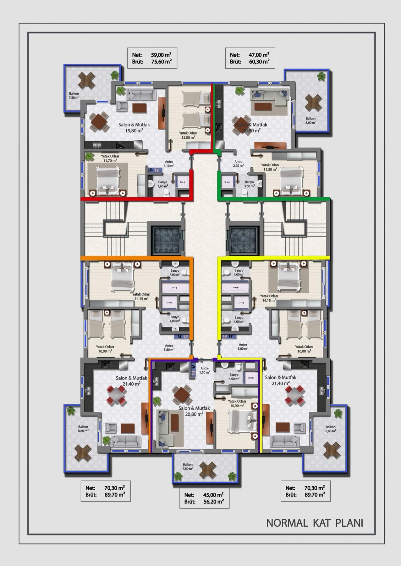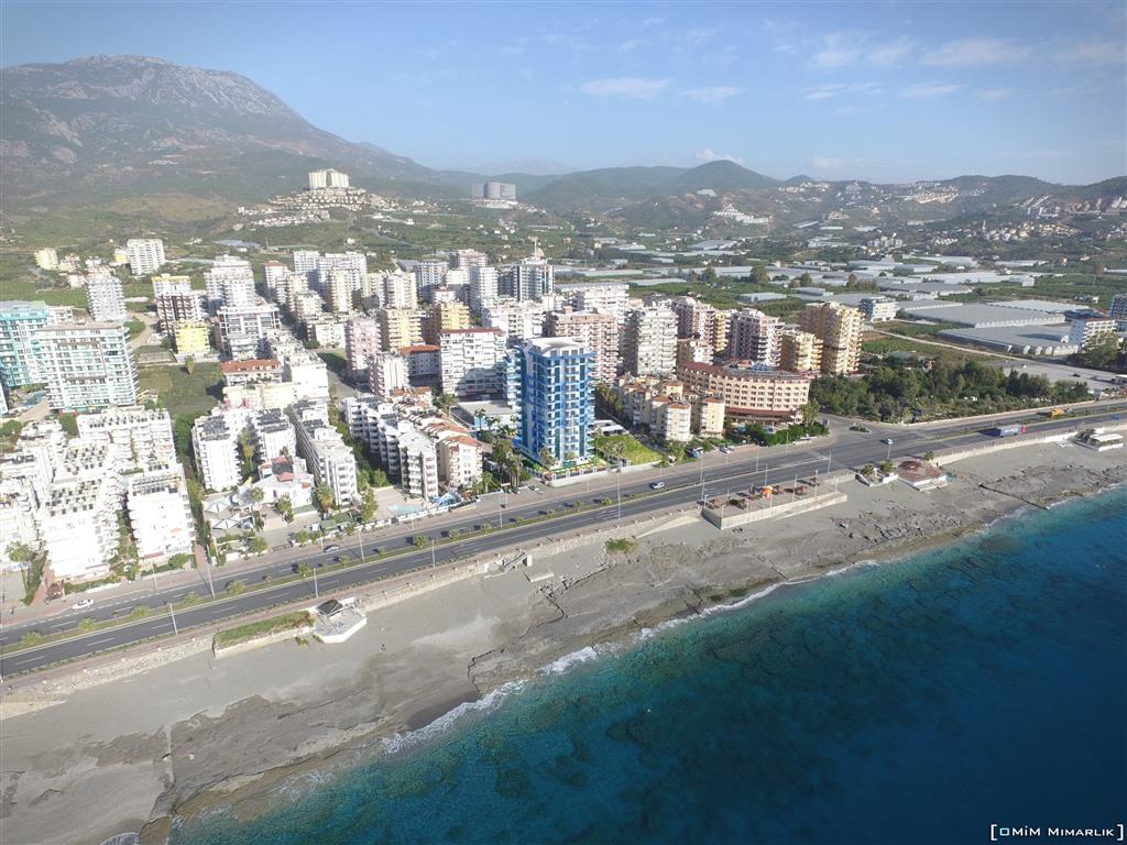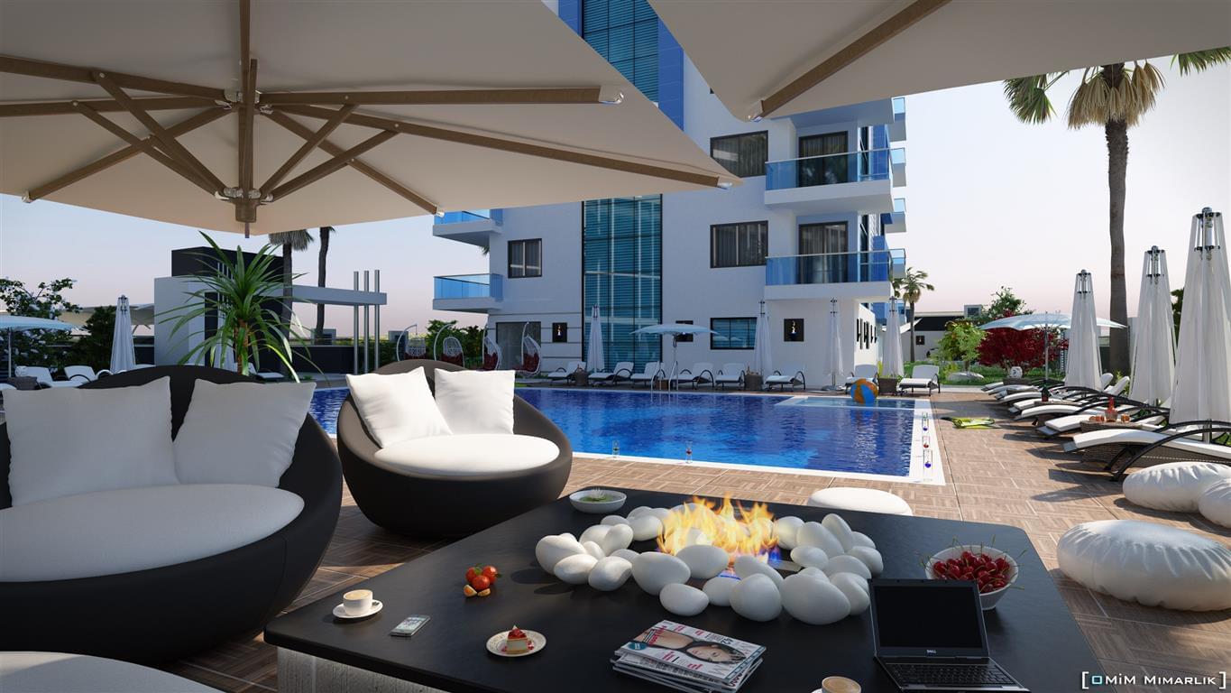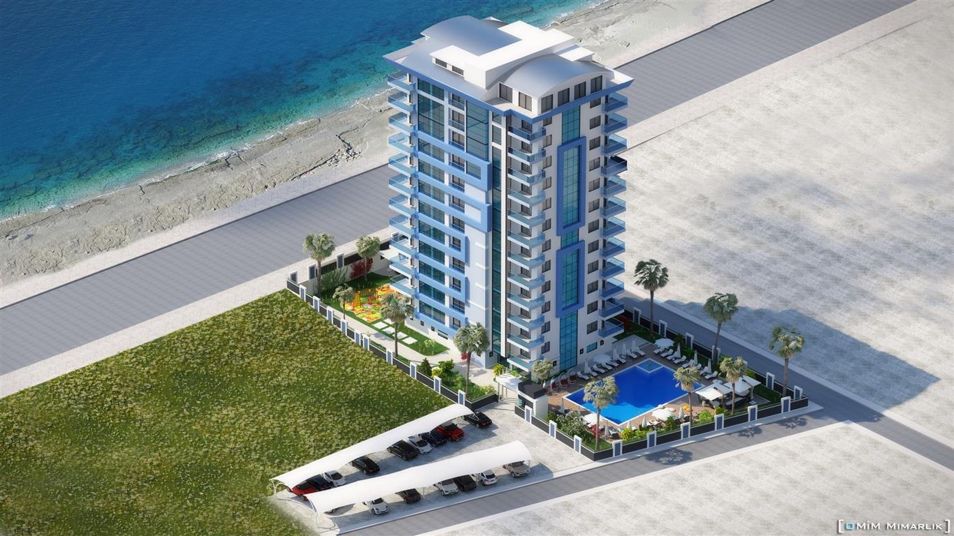 Нашим покупателям предлагается широкий выбор квартир различных типов и планировок: 1+1, 2+1, 3+1, 4+1. Комплекс располагается на первой береговой линии, благодаря этому практически из всех квартир открывается красивый вид на море.