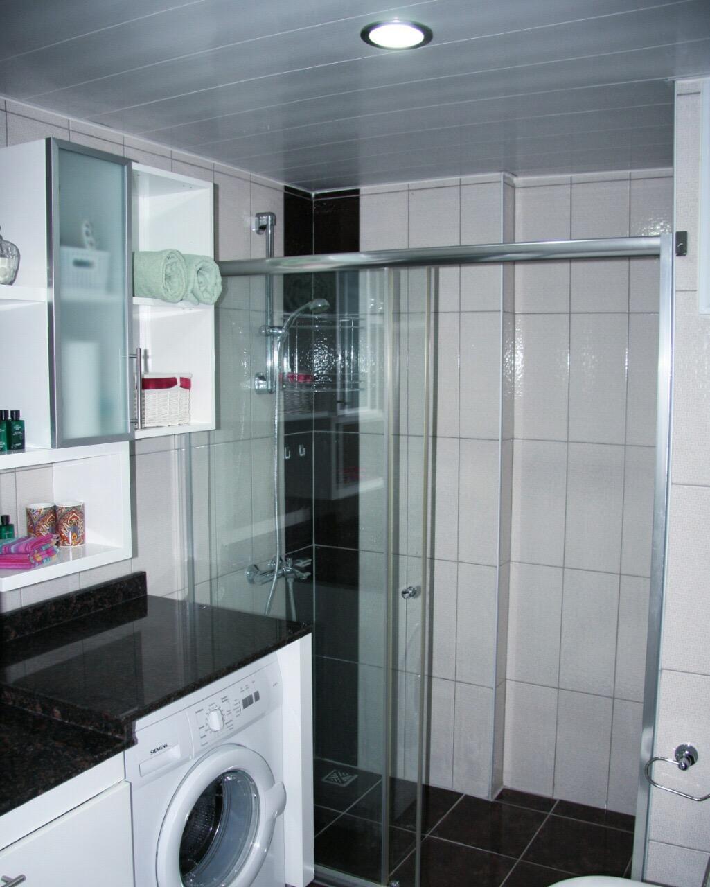 Ванная комната: Сантехника, душевая кабина, электрический водонагреватель, стиральная машина Сименс.