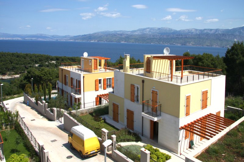 На самом высоком месте в Сплитска на склоне холма находится комплекс вилл с волшебным видом на далматинское море с современной средиземноморской архитектурой под немецко/хорватским руководством. В виллах оснащение высшего качества – каждый дом имеет собственный бассейн – качество изготовления соответствует немецким стандартам. Проект предназначен для покупателей,  для которых важны качество и безопасность. Не только бассейн и средиземноморский сад, но и внутренняя отделка дома очень высокого уровня. Некоторые особенности: пластковые окна, средиземноморские каменные полы, открытый камин в гостиной, паркет в спальных, кондиционеры, также подогрев полов во всех ванных комнатах, современная арматура в ванной и высококачественная кухонная техника, большая терраса с деревянной беседкой, ограда с электрическими воротами, 2 автостоянки, фасад с замысловатой архитектурой с цветной штукатуркой и каменной облицовкой.