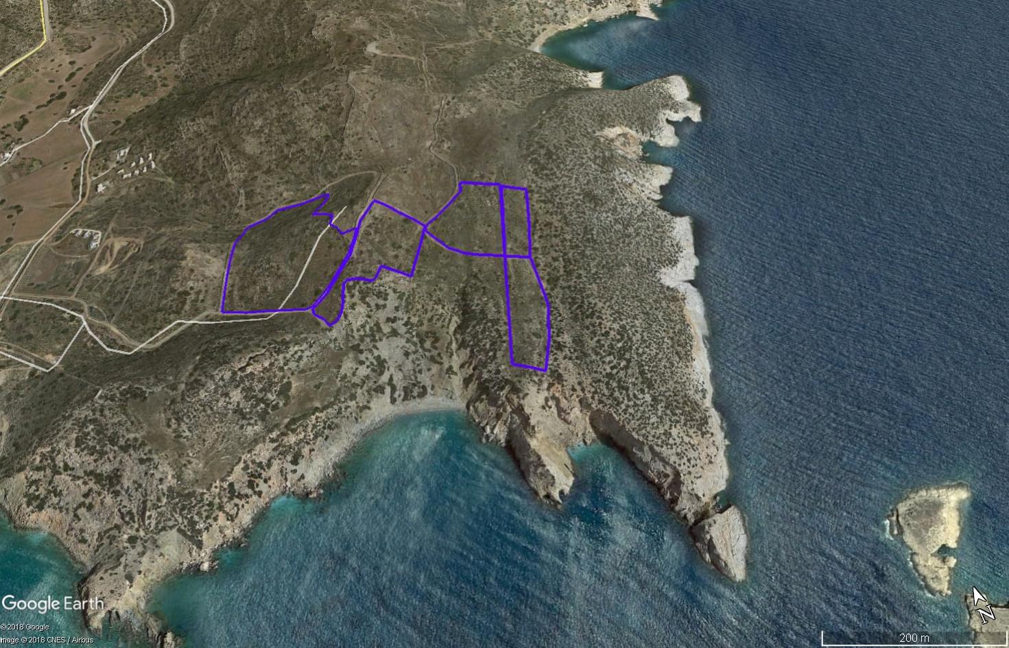 Ios - Cyclades - Greece . 5 adjacent plots of total area of 73136 sq.m. With access to road. Just 80m from the seashore. 25’ by car from Ios center and only 15’ by boat from Oia of Santorini. In walking distance from Manganari beach. Suitable for the construction of private villas or hotels. Buildable potential 3600 sq.m.
