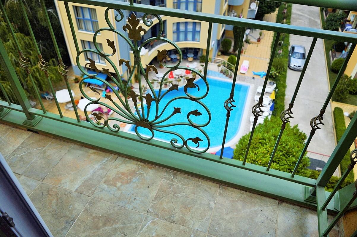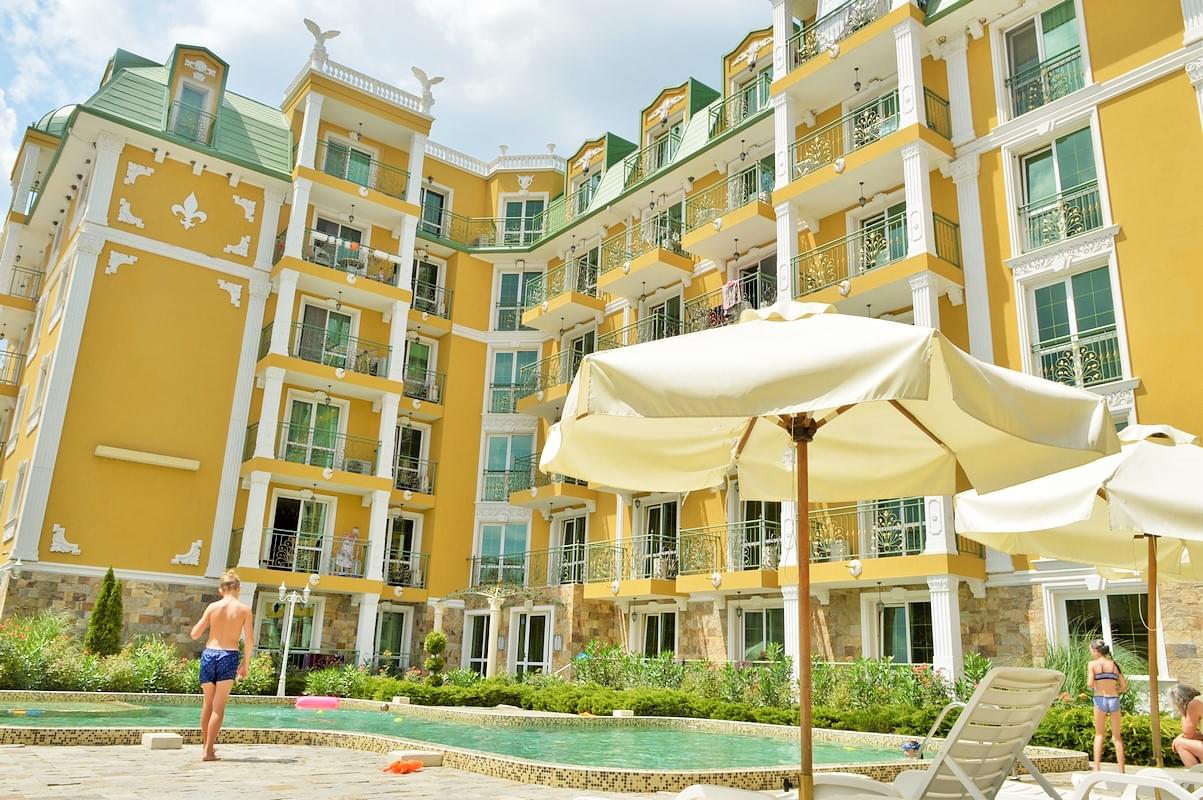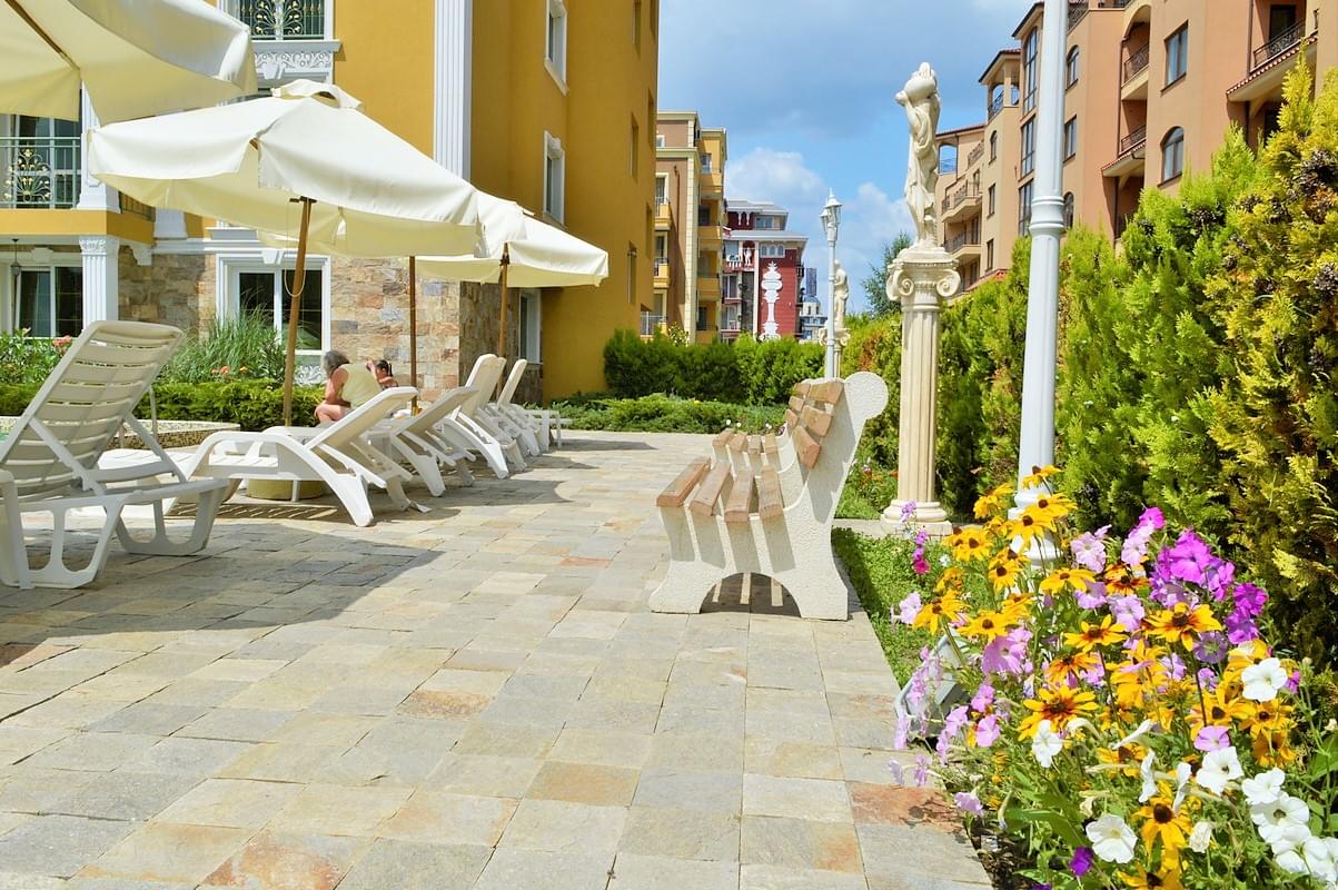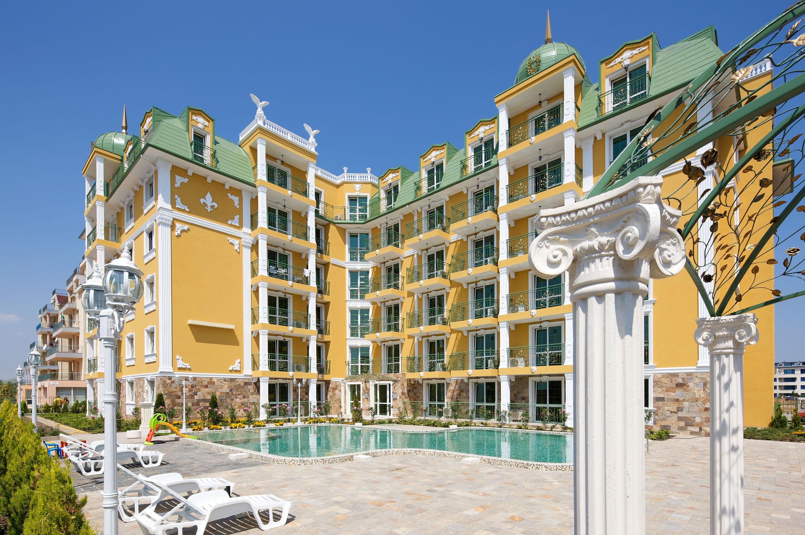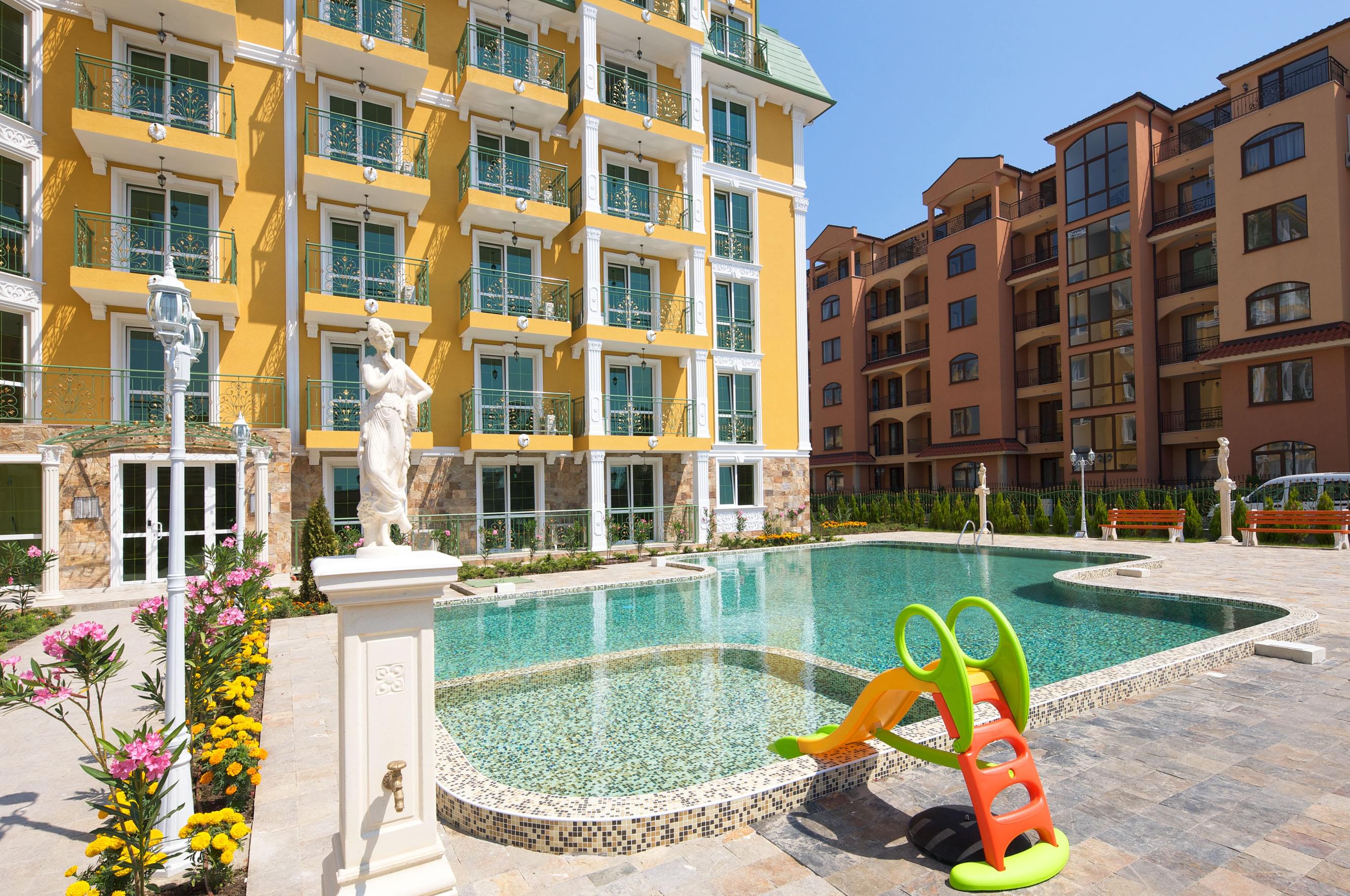 Arco Real Estate offers for sale a spacious two bedroom apartment in an exclusive gated complex on the Bulgarian Black Sea coast in Sunny Beach, built in the exquisite style of the French neoclassical baroque. The complex is the perfect combination of a place for year-round use and a vacation home on the sea. The complex features a maximum functionality, offering all its inhabitants the following amenities: a swimming pool with heating and a children’s section, a beautiful garden, an antique gazebo, a fountain, luxurious elevators and romantic night lighting that highlights the architectural style of the project and the elite status of the complex.