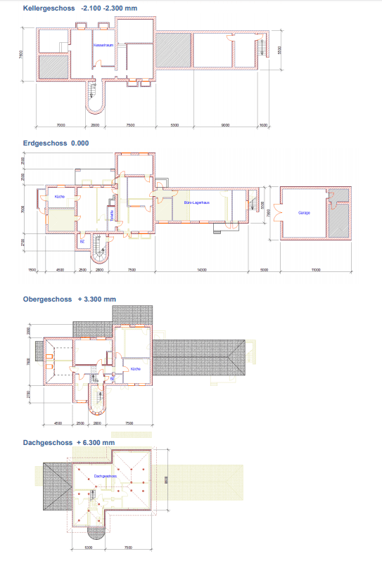 Основная часть здания имеет 2 этажа, большой подвал (143,9 м2) и просторный чердак. Первый этаж со служебными и офисными помещениями (160,9 м2, 5 комнат, туалет, идеально подходит для бизнеса), 2 этаж - 4-комнатная квартира (110,0 м2, с туалетом и ванной комнатой, очень светлая с видом на город и лес). Здание имеет отдельные входы (2 на первом этаже, 1 на второй жилой этаж и в подвал).