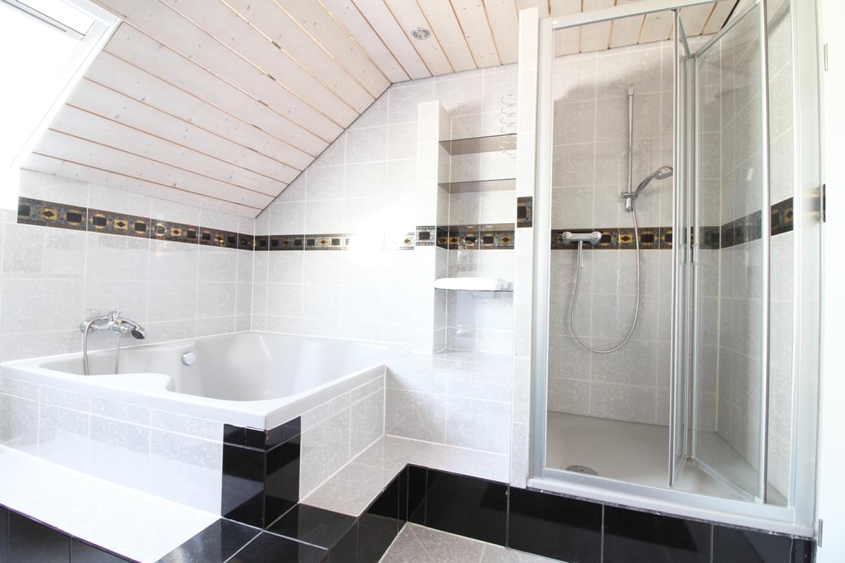 Vom Eingang geradeaus gelangen Sie über eine gemauerte und beleuchtete Treppe in den privaten Wohnbereich im Obergeschoss. Dort empfängt Sie ein großzügiges und helles Studio mit einer extra Dachterrasse. Weiter im Wohnbereich des Obergeschosses befindet sich neben dem Gästezimmer mit kleinem Duschbad auch das Elternschlafzimmer mit Ankleide. Ein geräumiges Bad mit Doppelwaschbecken, Eckbadewanne und Dusche rundet den Wohnbereich ab.