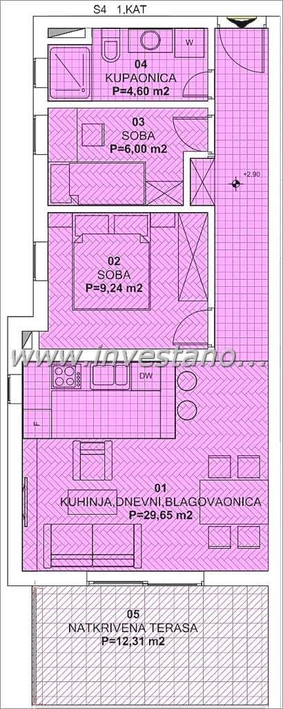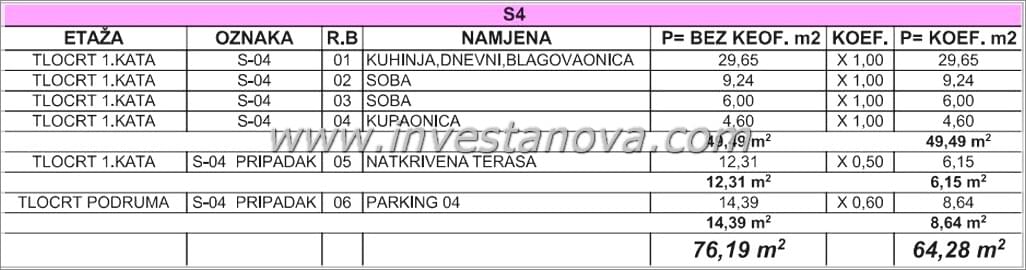 Квартира S4: 64,28 м2 x 1950 € м2 = 125 346 €