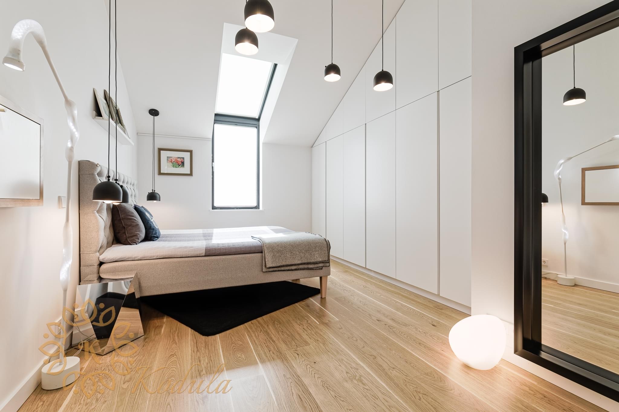 В интерьере квартиры использованы качественные материалы и современные решения. Дизайн интерьера с индустриальными нотками не только современный, но и уютный. Натуральные цвета, индивидуальный дизайн и тщательно подобранные детали придают квартире комфорт и домашнее тепло. Кухня оборудована современной встроенной техникой, мебель и освещение изготовлены на заказ. В квартире есть водяные полы с подогревом, в каждой комнате находятся отдельные термостаты для регулирования отопления. Электрические полы с подогревом в ванной. В комнатах установлена система вентиляции с рекуперацией тепла. На террасу можно выйти как из кухни, так и из гостиной.