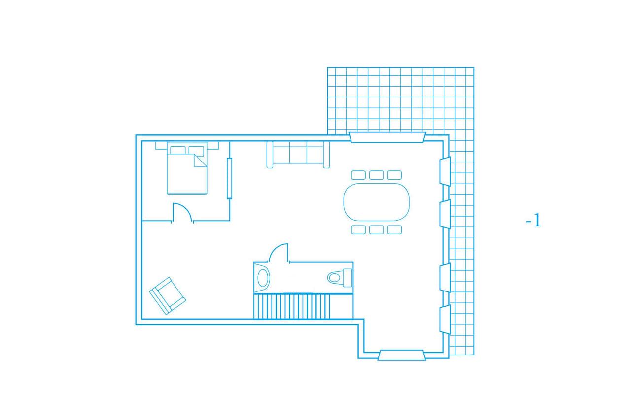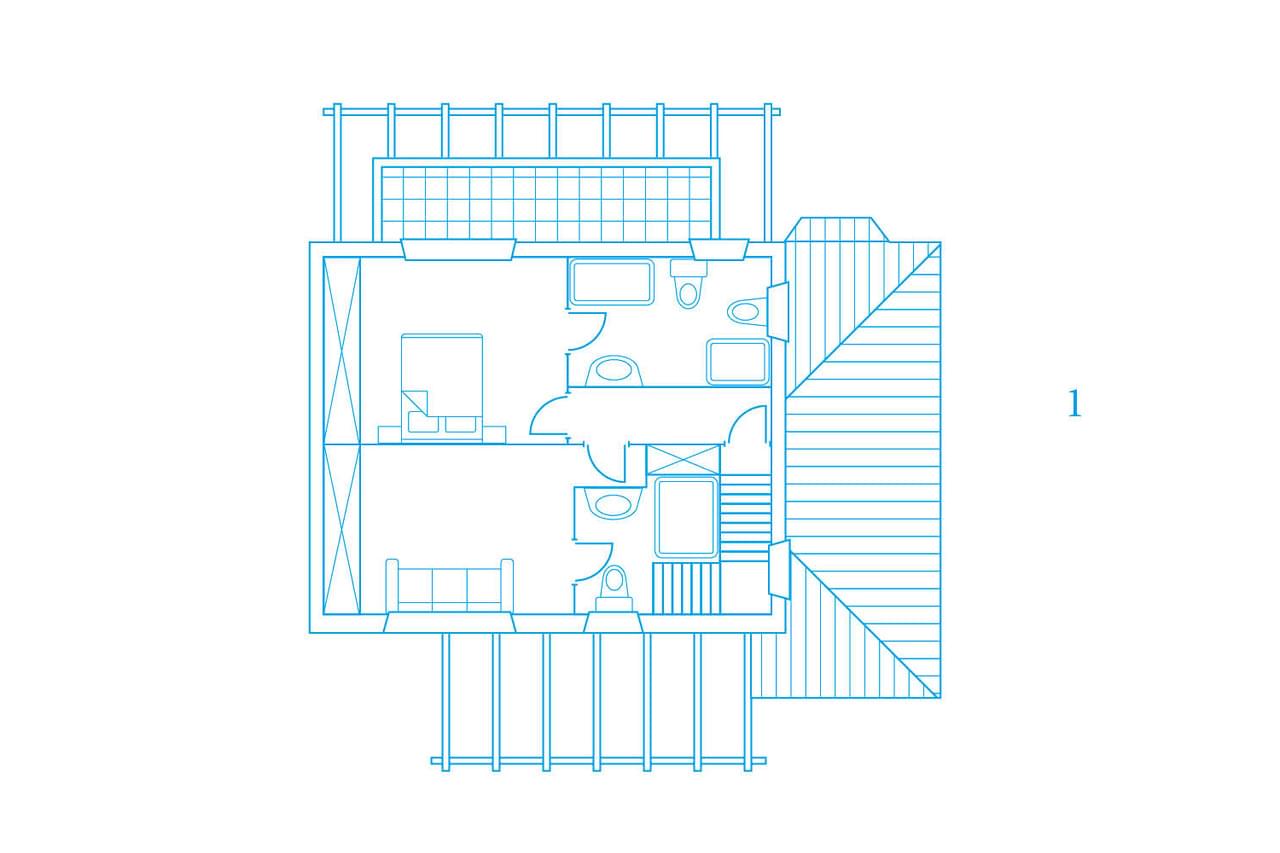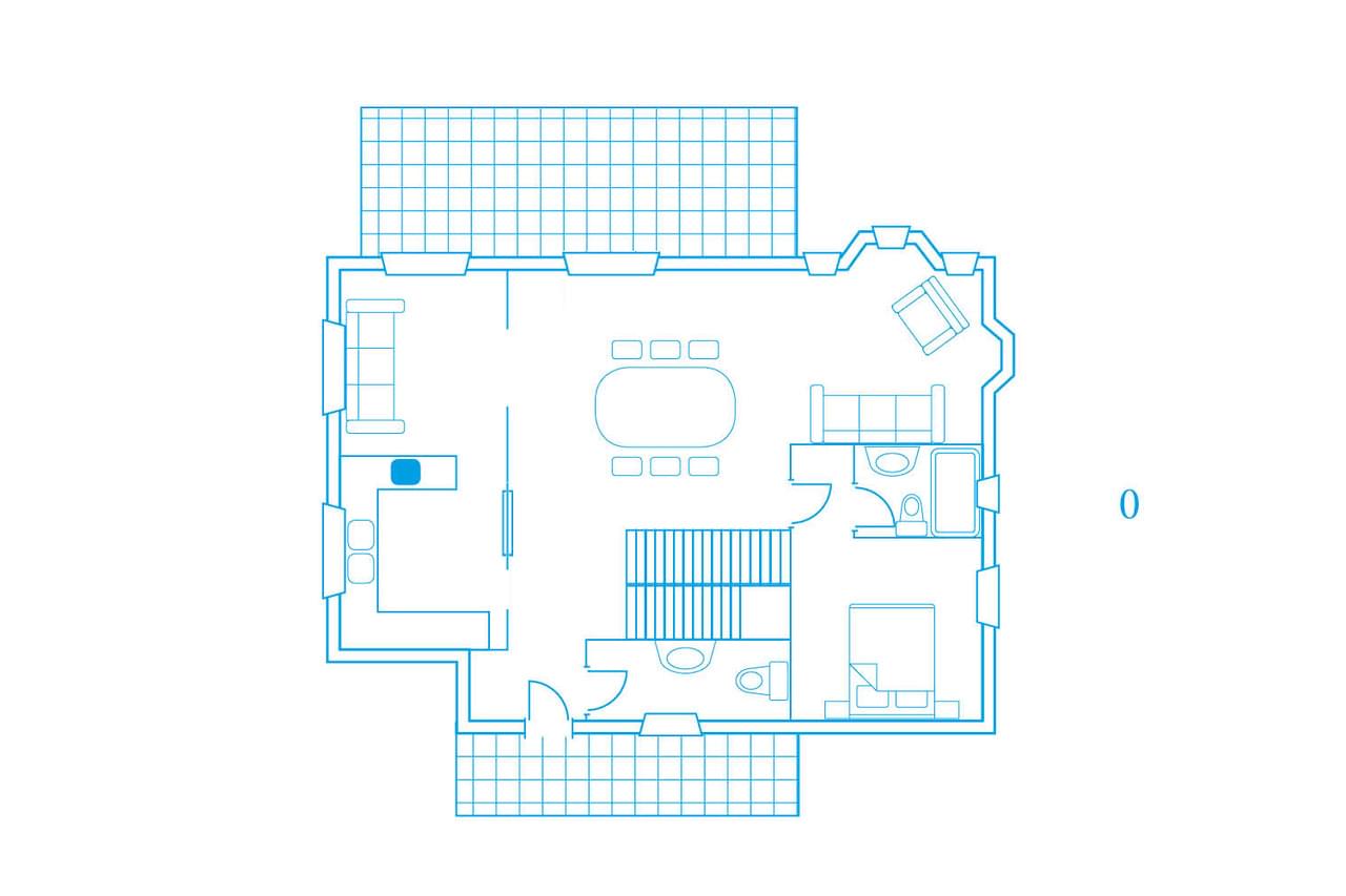 Заявленная площадь 350 м2 соответствует жилой площади 270 м2. Жилая часть занимает три просторных уровня: гостиная/столовая открыта для кухни. Отдельная столовая с дровяной плитой рядом с кухней в настоящее время используется в качестве офиса. В каждой из трех просторных спален есть ванная комната. Главная ванная комната отличается наличием парового душа в дополнение к ванне. Скатная крыша с деревянными панелями на всем верхнем этаже создает ощущение лофта.