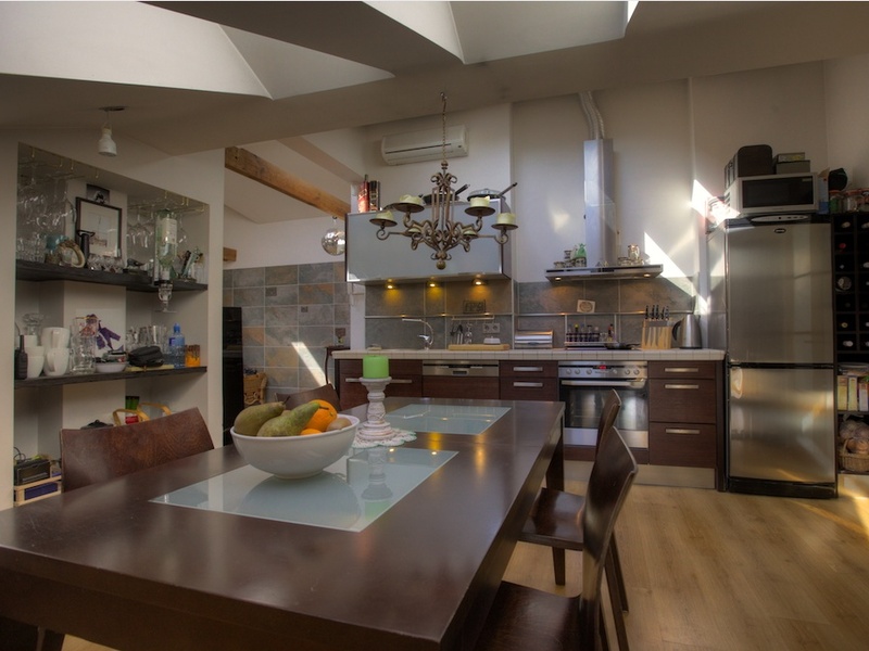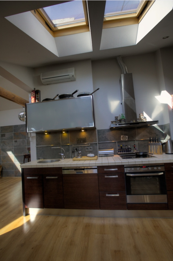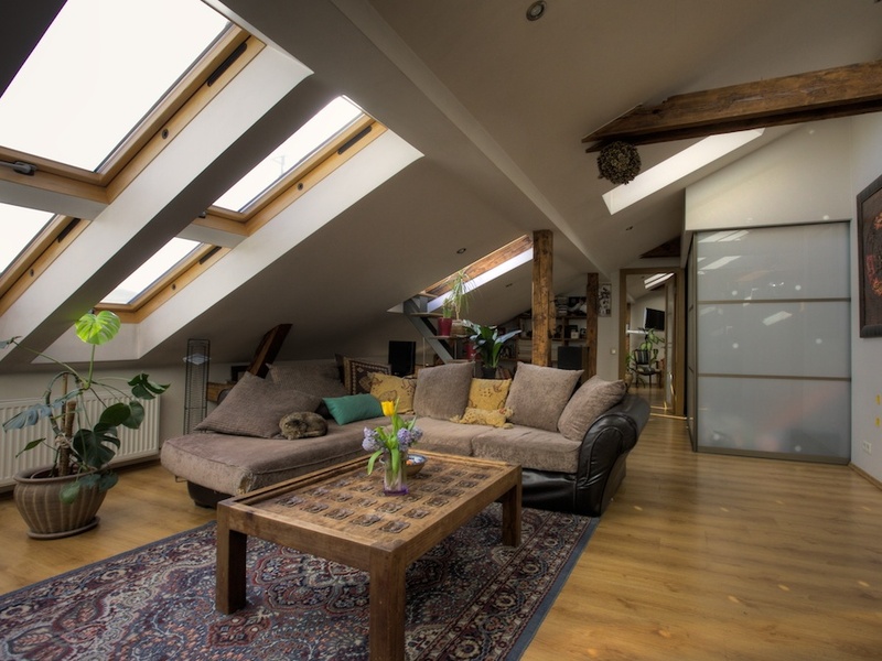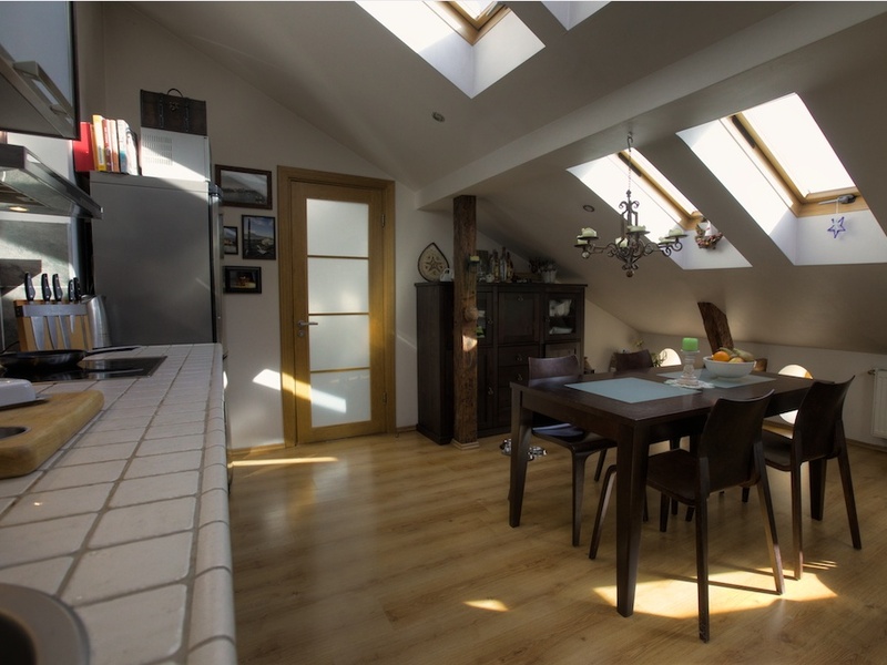 Просторная квартира мансарда. В отделке квартиры использованы высококачественные материалы - паркет, каменная плитка, дизайнерская мебель, хорошая техника. Включает: - гостиную с кухней - спальню - детскую комнату / рабочий кабинет - просторную ванную комнату. Газовое отопление, полы с подогревом. Из квартиры есть выход на террасу с видом на центр города и башни Старого города. Одно места парковки во дворе дома.