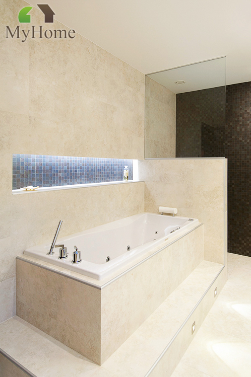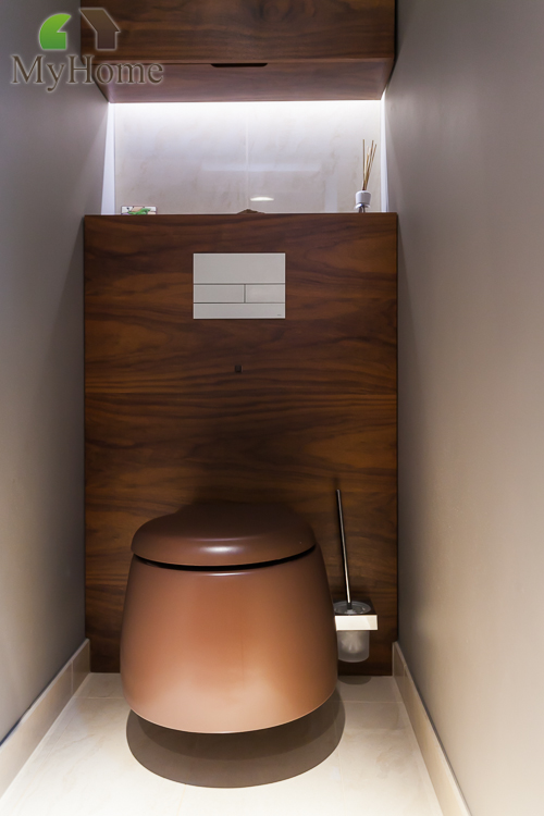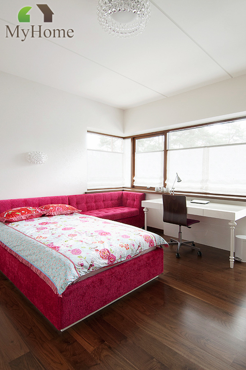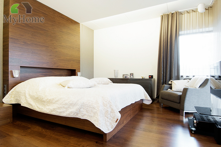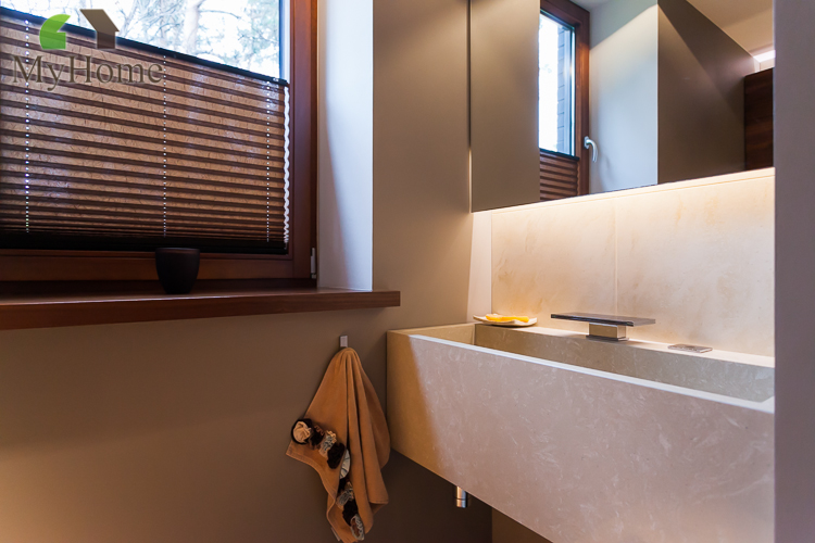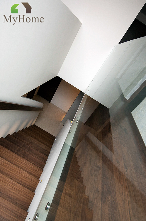 В оформлении всего дома по возможности использовались натуральные материалы - от камня до дерева, теплая и спокойная цветовая гамма напоминает о восточных мотивах. Пол первого этажа покрывает красивый и практичный сжатый мрамор, который легко чистится и на котором не остается следов. Благодаря напольному отоплению камень под ногами не холодный. Полы в других комнатах покрывает паркет (американский орех). Гостиной придает уют камин с дровяным отоплением, длинная каминная полка из камня производит шикарное впечатление. Во всем доме встречается экзотический узор, вырезанный на дереве (техника интарсия), выгравированный на стекле и металлических поверхностях, а также на задней стене туалета этажа со спа; на этот мотив создателей вдохновила русская шаль. Цокольный этаж так же хорошо освещен, как и два верхних этажа, благодаря находчивому решению архитектора использовать наклонную плоскость в образовавшемся углублении для установки окон от пола до потолка. Основной акцент в интерьере домашнего спа делается на потолок и освещение. Паровая сауна имеет электрическое отопление, но ее камни весом 200 кг дают тот же эффект, что и банная печь на дровах. В гараж ведет наклонная плоскость с подогревом. В гараж помещается одна машина, но пространства достаточно и для хранения садового инвентаря. Закрытый двор вмещает еще по крайней мере две машины.