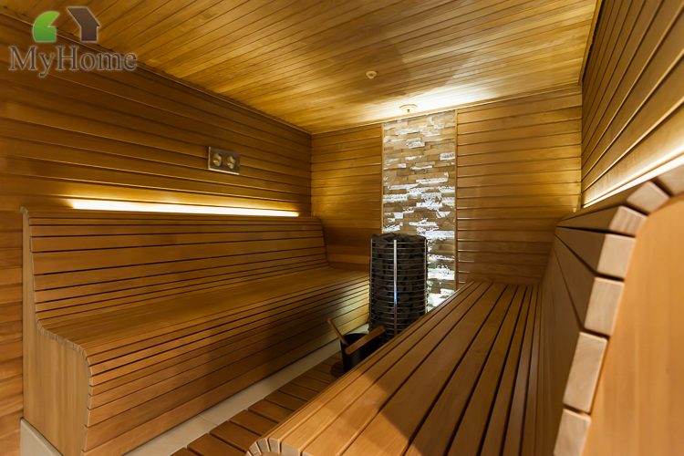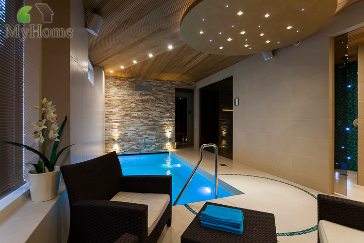 На первом этаже здания располагается просторная прихожая, гостиная, кухня-столовая, большая терраса, гостевой туалет и подсобное помещение. На втором этаже находятся 3 спальни, домашний офис, большой балкон, очень просторная гардеробная, ванная комната с джакузи и окном, душ и туалет. На цокольном этаже дома располагается домашний спа с бассейном, паровой баней, финской сауной, душевыми и туалетом. На цокольном этаже находится техническое помещение с кладовой и местом для хранения, гараж, а также домашний винный погреб.
