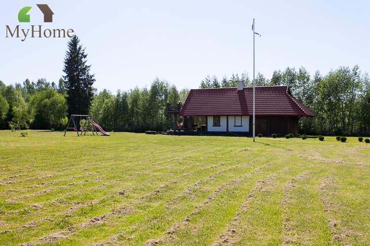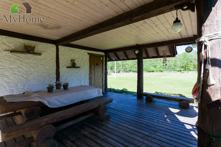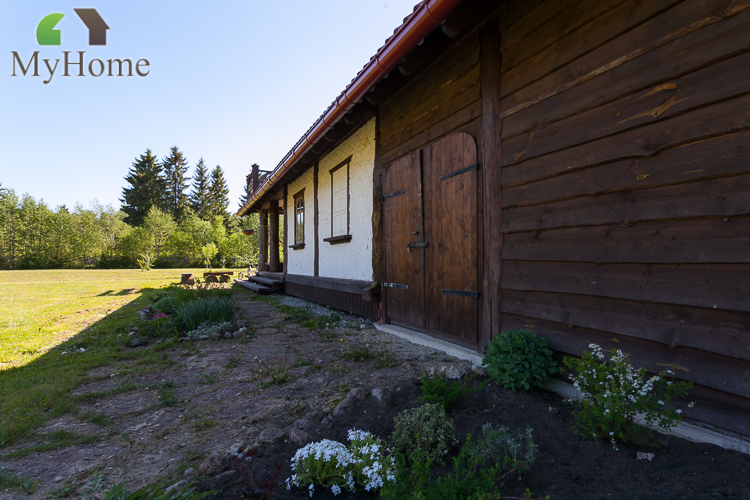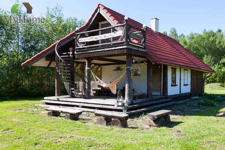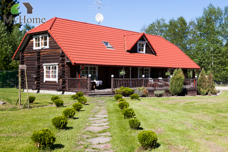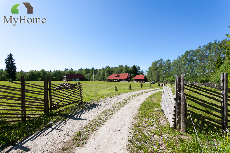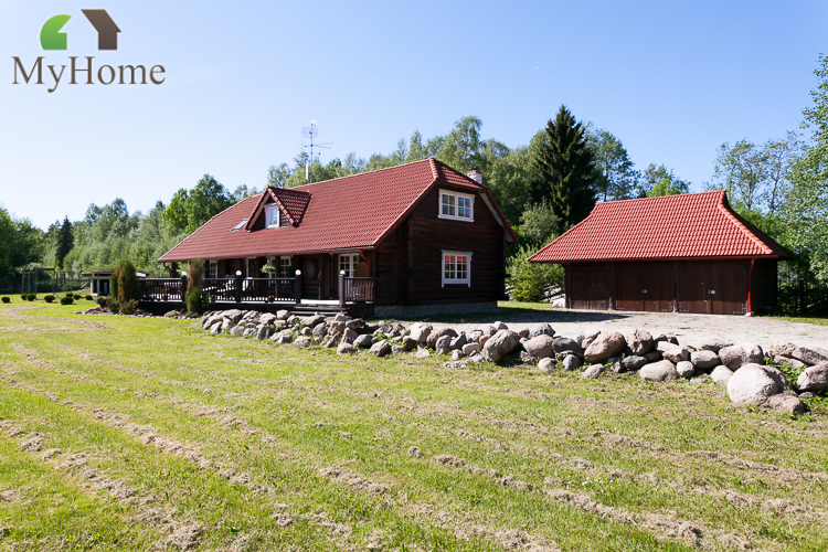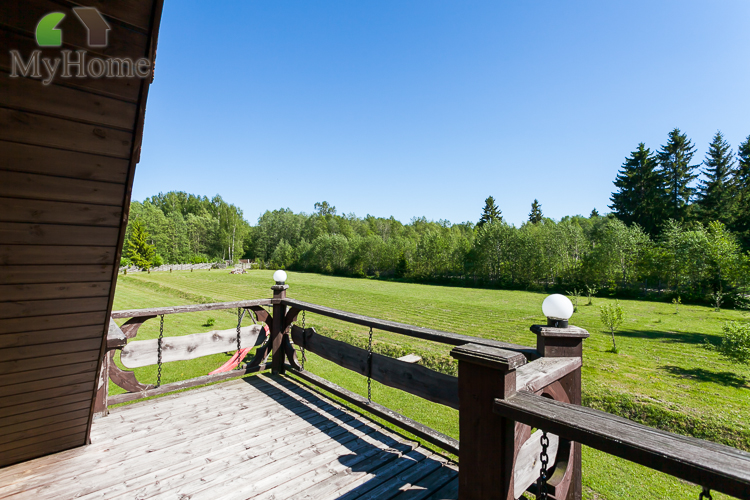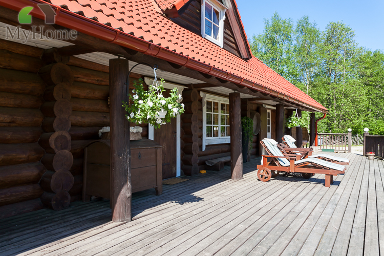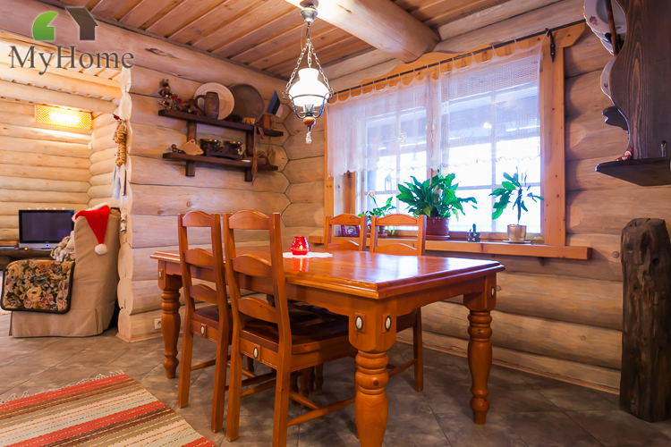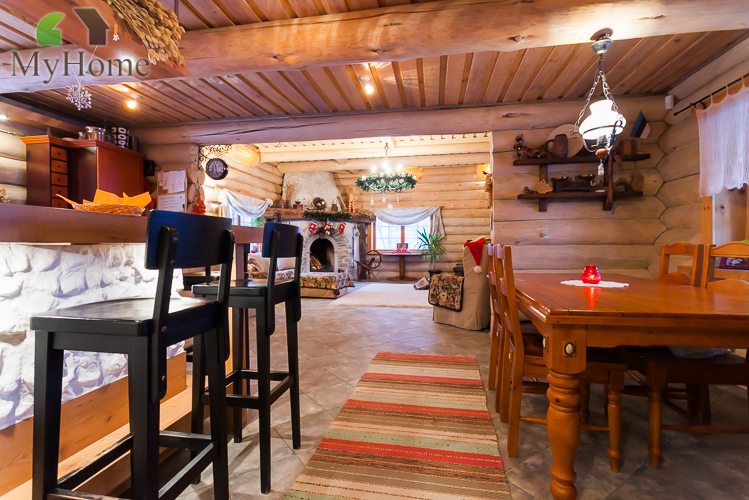 Жилой дом планировался двухэтажным, и спроектирован из круглых брёвен, изготовленных вручную. В правом крыле первого этажа здания находится большая гостиная с камином. Из гостиной через двустворчатую балконную дверь открываются вид и выход на большую солнечную террасу, расположенную с южной стороны дома. Вход в дом - через частично крытую террасу и находящийся в средней части здания парадный вход. Гостиная объединена с кухней и столовой. На нижнем этаже здания также находятся главная спальня с просторной ванной с большим окном и техническое помещение. Из передней лестница поднимается на второй этаж, где расположены две спальни, гардеробная, ванная и кабинет. Банный домик двухэтажный, с общей площадью 96 м2. На нижнем этаже находятся предбанник с камином, раздевалка, туалет, душевая и парилка с дровяным отоплением. Перед баней – большая терраса. С террасы лестница ведёт наверх, на второй этаж, который занимает одна большая комната. В бане также имеется вместительная кладовая с отдельным входом. Гараж рассчитан на 2 автомобиля, места хватает для хранения печных дров и садовых инструментов, общая площадь здания – 64 м2. Водоснабжение обеспечено собственным колодцем, а сточные воды отводятся в коллектор. Система отопления дома спроектирована на древесно-газовом котле. Данный котёл отличается большой надёжностью, высоким коэффициентом полезного действия, и его обслуживание не представляет больших трудностей. Дополнительным источником отопления является мощная каминная печь с массивными деревянными элементами, что подарит Вам и эстетическое удовольствие. Интерьер дома оформлен со вкусом, обставлен изготовленной по специальному заказу мебелью, входящей в цену продажи. Каждый элемент дизайна тщательно подобран и гармонирует с общим стилем дома. Территория жилого комплекса огорожена реечным забором, поблизости всего 2 соседей, но участок достаточно велик, чтобы обеспечить полное уединение. Весной на участке также обустроят пруд. Прекрасный дом, расположенный на лоне природы, находится всего в 12 км от столицы. Остановка общественного транспорта (автобус и маршрутное такси) – примерно в 750 м от дома.