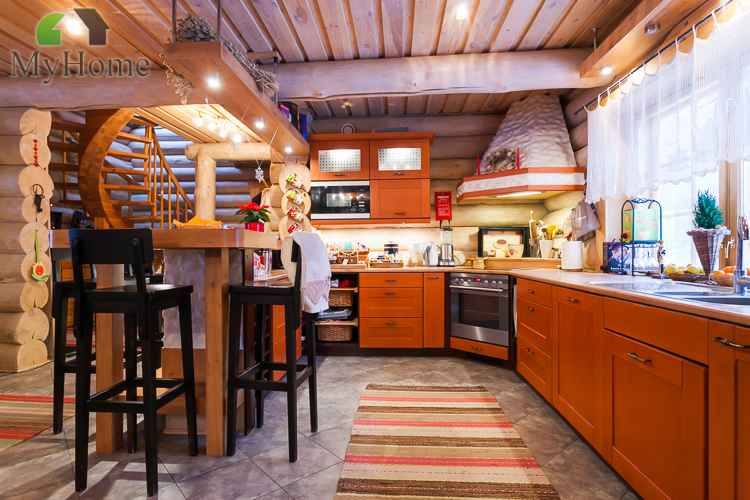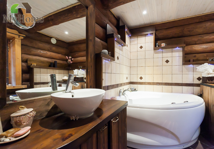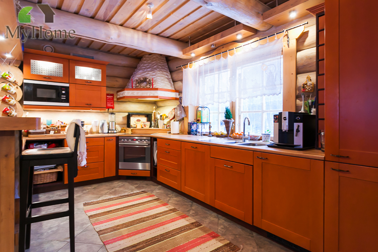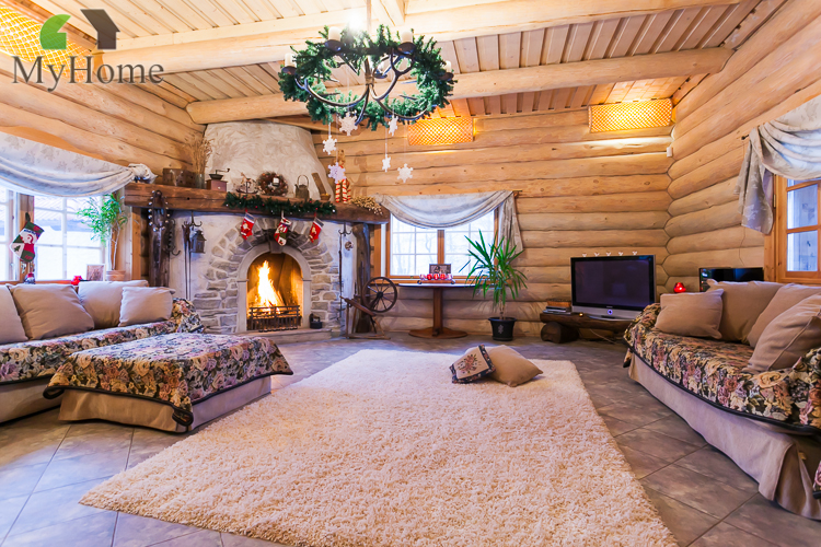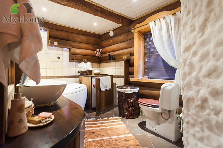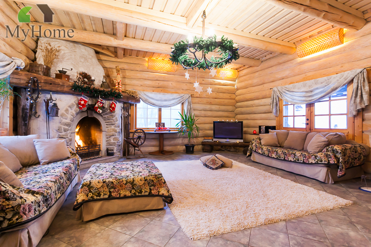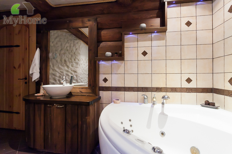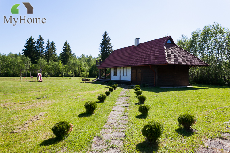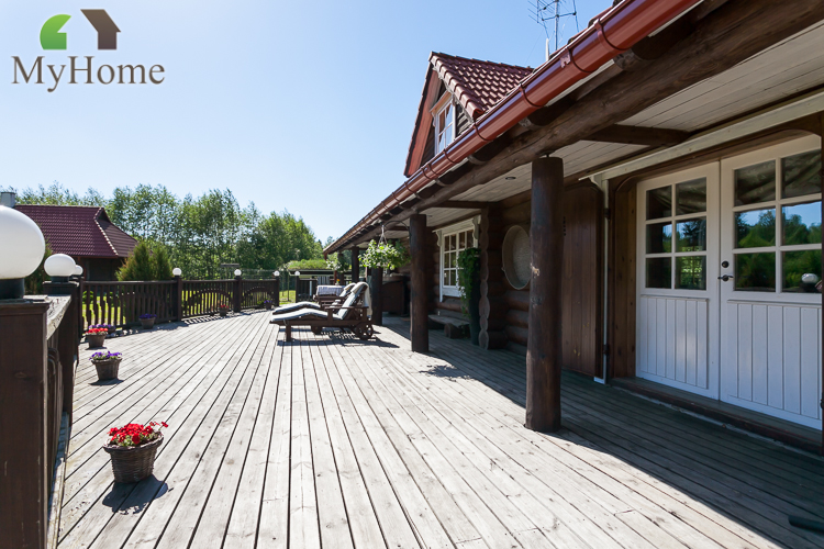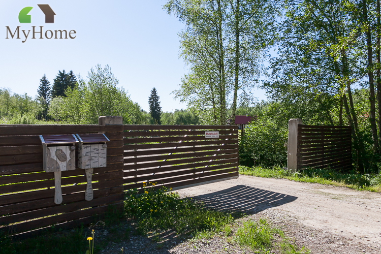 Жилой дом планировался двухэтажным, и спроектирован из круглых брёвен, изготовленных вручную. В правом крыле первого этажа здания находится большая гостиная с камином. Из гостиной через двустворчатую балконную дверь открываются вид и выход на большую солнечную террасу, расположенную с южной стороны дома. Вход в дом - через частично крытую террасу и находящийся в средней части здания парадный вход. Гостиная объединена с кухней и столовой. На нижнем этаже здания также находятся главная спальня с просторной ванной с большим окном и техническое помещение. Из передней лестница поднимается на второй этаж, где расположены две спальни, гардеробная, ванная и кабинет. Банный домик двухэтажный, с общей площадью 96 м2. На нижнем этаже находятся предбанник с камином, раздевалка, туалет, душевая и парилка с дровяным отоплением. Перед баней – большая терраса. С террасы лестница ведёт наверх, на второй этаж, который занимает одна большая комната. В бане также имеется вместительная кладовая с отдельным входом. Гараж рассчитан на 2 автомобиля, места хватает для хранения печных дров и садовых инструментов, общая площадь здания – 64 м2. Водоснабжение обеспечено собственным колодцем, а сточные воды отводятся в коллектор. Система отопления дома спроектирована на древесно-газовом котле. Данный котёл отличается большой надёжностью, высоким коэффициентом полезного действия, и его обслуживание не представляет больших трудностей. Дополнительным источником отопления является мощная каминная печь с массивными деревянными элементами, что подарит Вам и эстетическое удовольствие. Интерьер дома оформлен со вкусом, обставлен изготовленной по специальному заказу мебелью, входящей в цену продажи. Каждый элемент дизайна тщательно подобран и гармонирует с общим стилем дома. Территория жилого комплекса огорожена реечным забором, поблизости всего 2 соседей, но участок достаточно велик, чтобы обеспечить полное уединение. Весной на участке также обустроят пруд. Прекрасный дом, расположенный на лоне природы, находится всего в 12 км от столицы. Остановка общественного транспорта (автобус и маршрутное такси) – примерно в 750 м от дома.