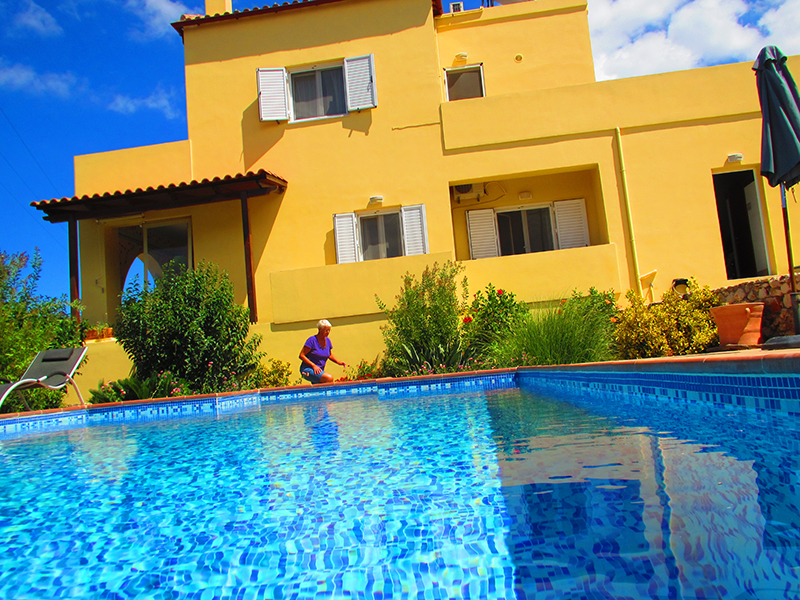 Гавалохори. Дом расположен на большом участке земли площадью 36 соток. Общая площадь дома составляет 120 м2 жилой площади + просторный гараж со своей ванной комнатой и туалетом. В доме на первом этаже расположено 3 спальных комнаты с большими террасами и балконами. На втором этаже расположен большой салон, совмещенный с кухней с красивым большим камином. Дом имеет прекрасный вид на залив «Суда» и « Белые» горы. Во дворе расположен небольшой бассейн площадью 25 м2 участок прилегающий к дому озеленен и облагорожен. Расстояние до аэропорта Ханья 38км.