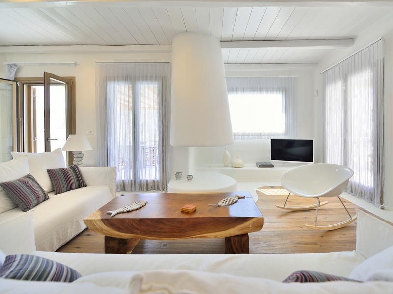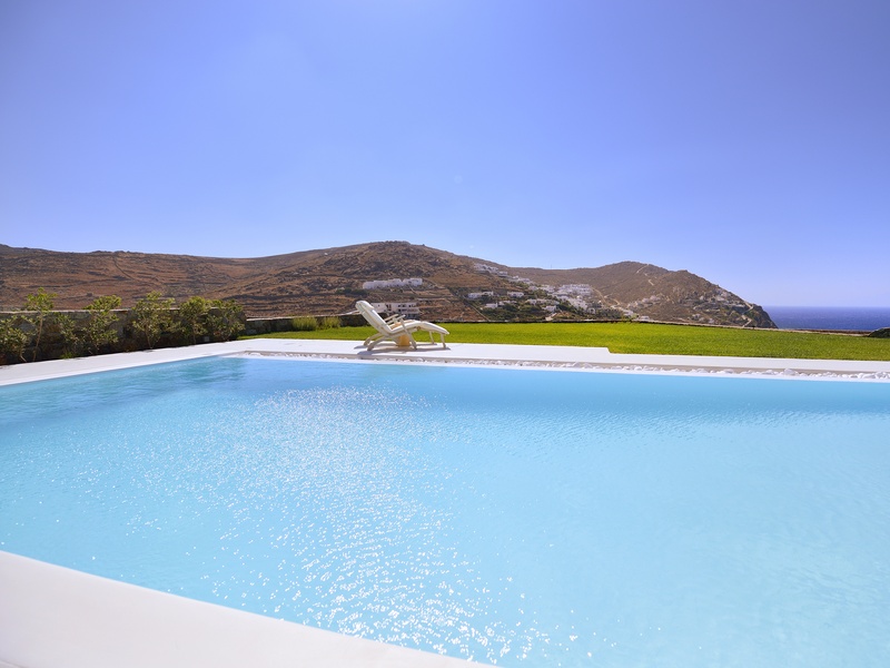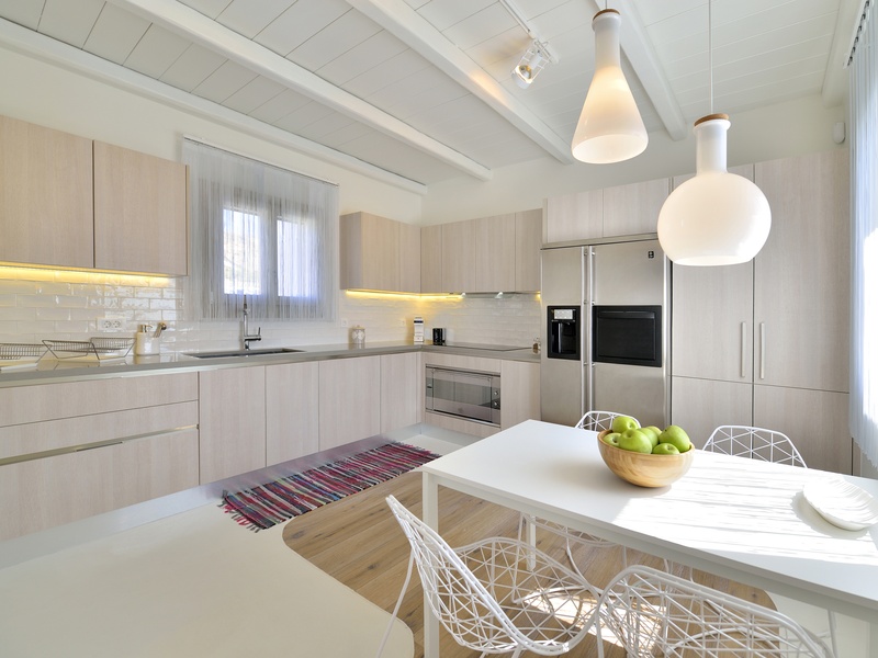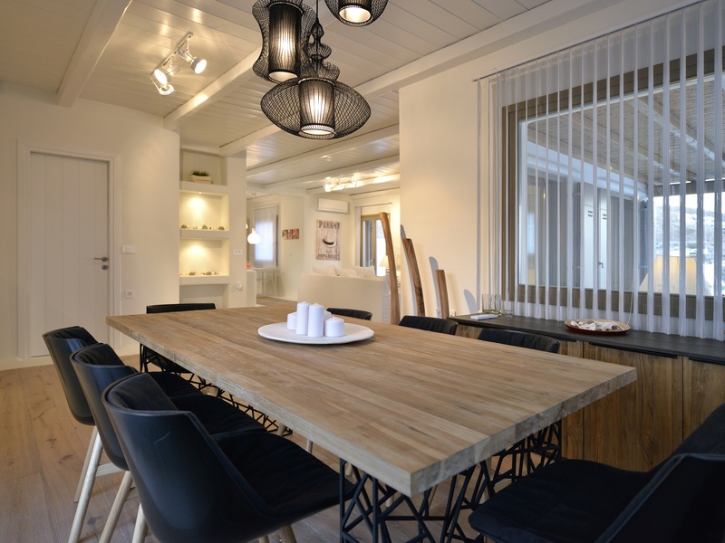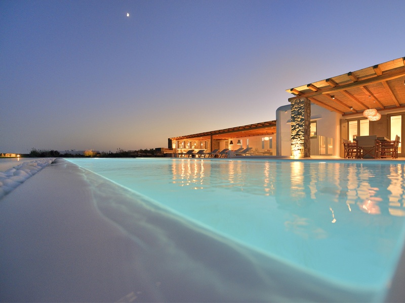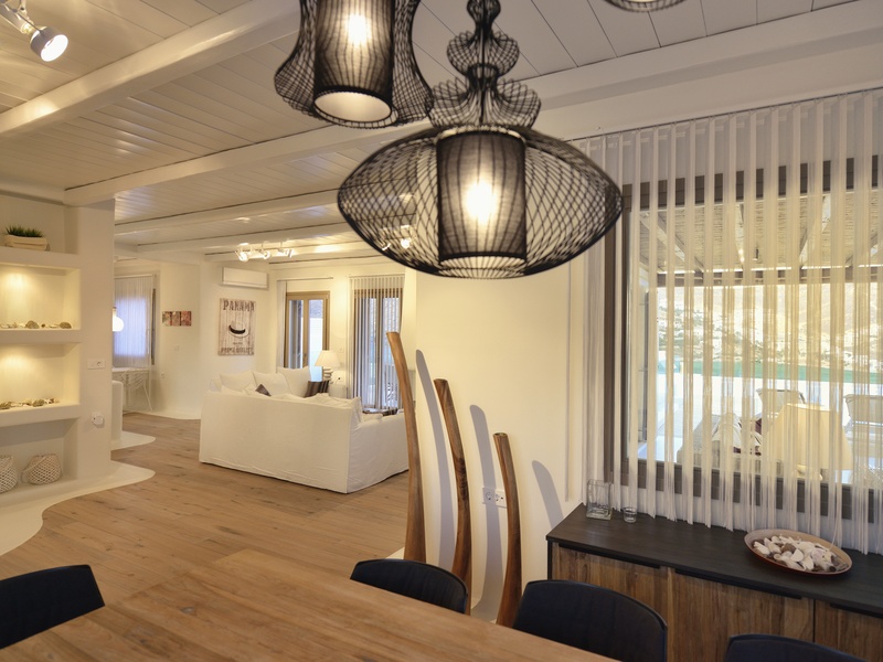 Вилла современна и проста,с роскошью сливается в одно целое,полная дизайнерская отделка,мебель от известных современных домов!Вилла расположена в жилом комплексе из 5 вилл,каждая имеет свой отдельный бассейн.Вилла 220кв.м. 4 спальни и еще одна для обслуживающего персонала,так же есть 4 ванных комнаты,камин,полное кондиционирование.Выходим к бассейну,здесь игра белых красок в сочетании с зеленым газоном и деревянной отделкой пола вокруг бассейна,создает впечатление полного релакса.В баре,который находится рядом с бассейном можно пропустить стаканчик...а большой обеденный стол на свежем воздухе готов принять большую компанию!Считаем нужным еще раз отметить работу дизайнера по выбору мебели и внутреннему оформлению виллы,на полах и стенах в ванных комнатах особенная белая краска и она доминирует на полах всей виллы.Вилла находится на возвышении и имеет красивый панорамный вид на пляж Элиа,что в переводе на русский значит оливка.Кстати добраться до этого пляжа можно пешком,можно на машине,вам решать,всего-то 700 метров от виллы!Сдается не меньше чем на 7 дней.