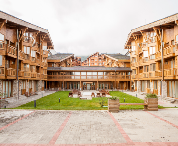 Здание построено с переходом в 5ти звездную гостиницу Pirin Golf Hotel и к СПА центру. Оно построено как комплекс из четырех соединенных между собой зданий, которые включают 5ти звездную гостиницу Pirin Golf Hotel , Спа Центр и 3 жилищных зданий...