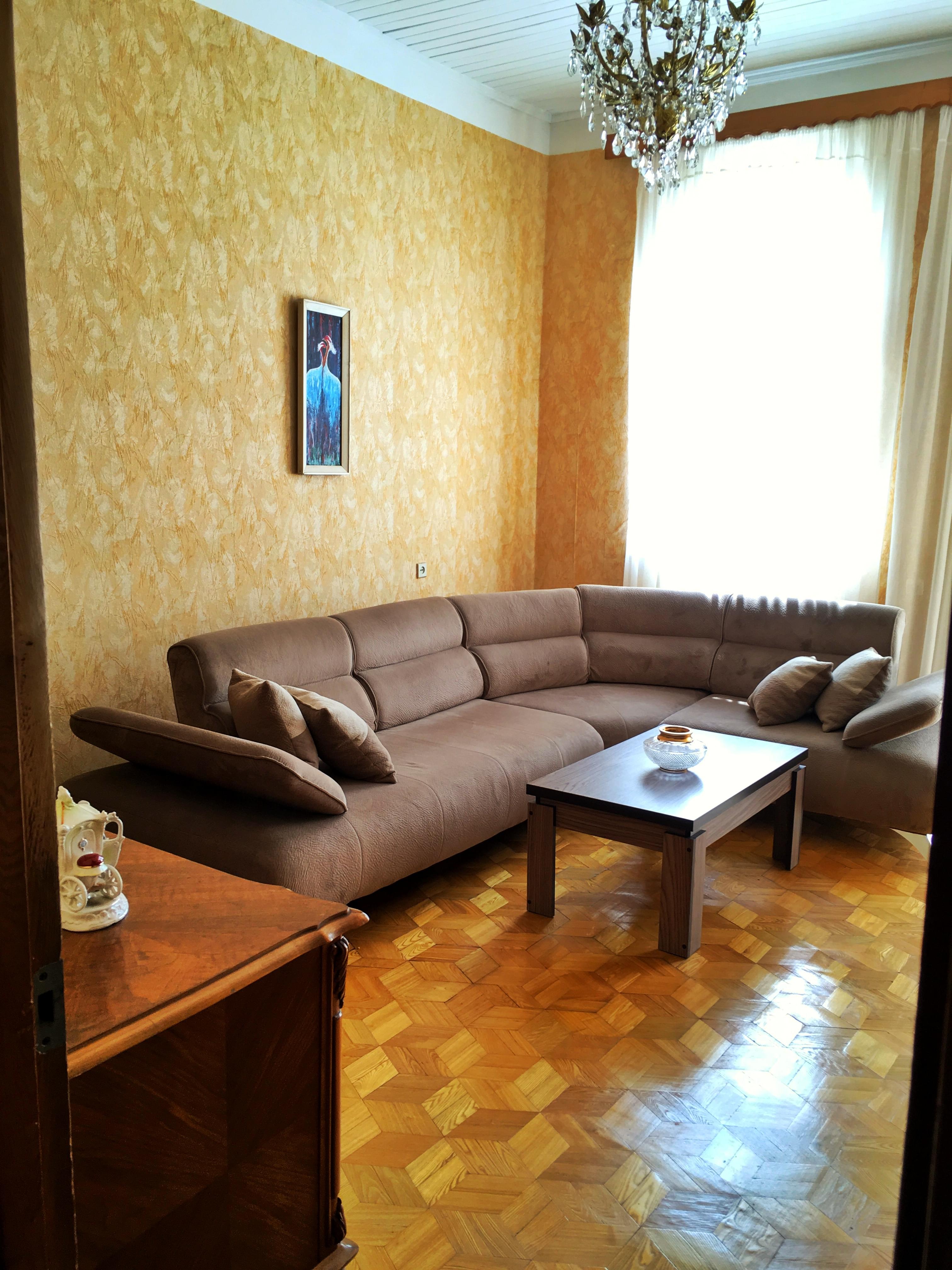 The apartment is located in the city center, near the city hall, in a calm environment. 176 sq.m., 3 bathrooms, 3 bedrooms, 3 balconies, 2 living rooms, a capital store on the first floor.