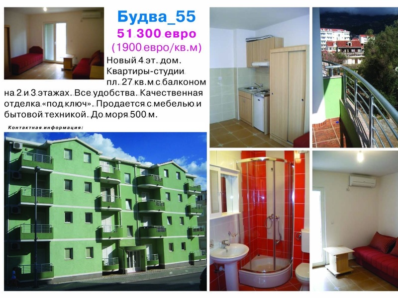Будва. Новый 4 эт. дом. Квартиры-студии пл. 27 кв.м с балконом на 2 и 3 этажах. Все удобства. Качественная отделка "под ключ". Продается с мебелью и бытовой техникой. До моря 500 м....